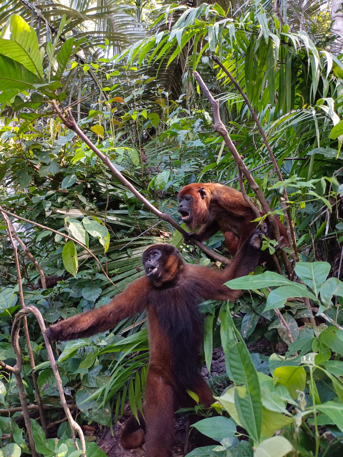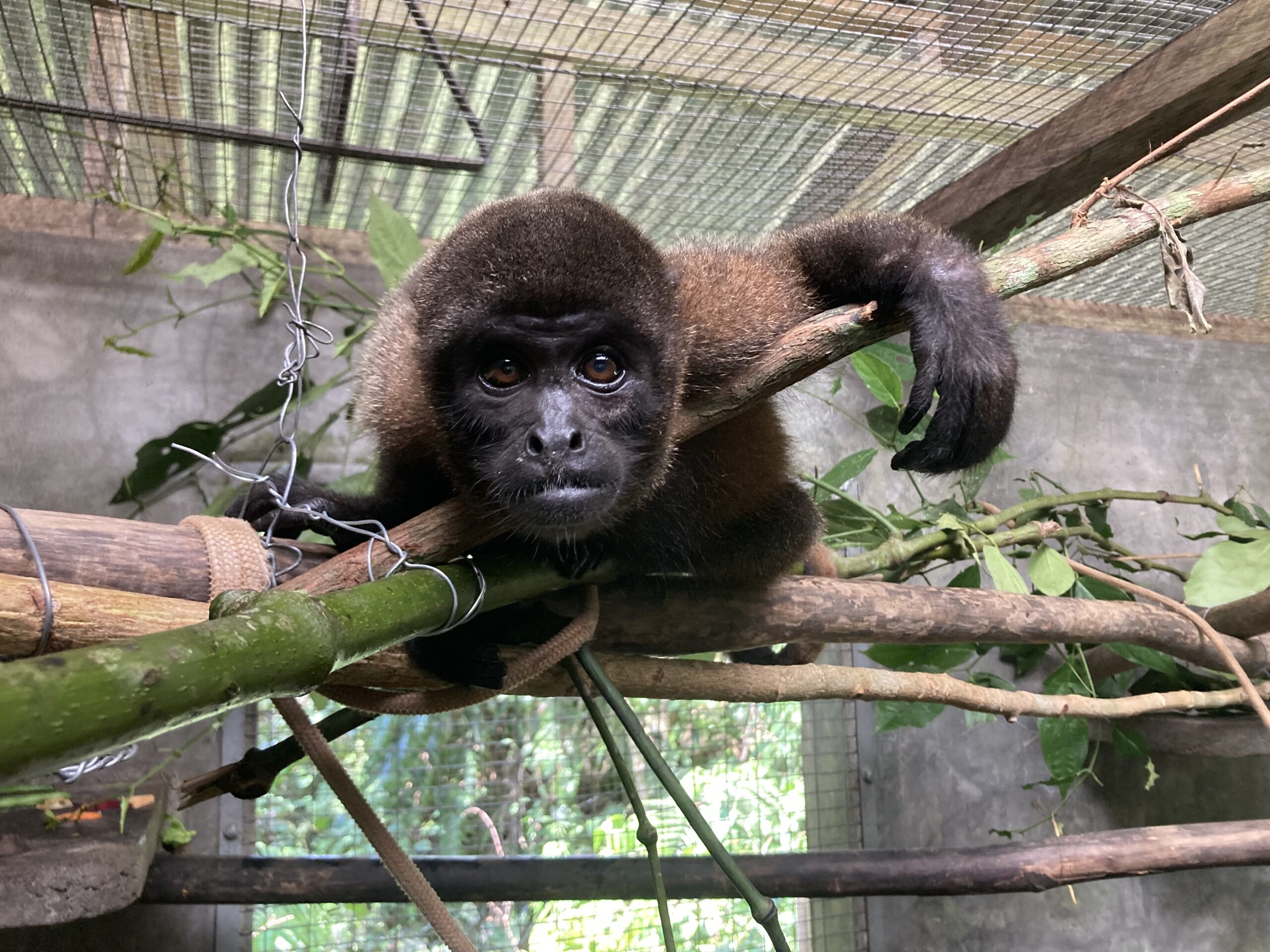 After feeling much better, Morena (female adult woolly monkey) went out again. The treatment worked and she seemed to have gained some self-confidence. She is playing more with others, like Maida (juvenile female howler) and Manok (juvenile male woolly).