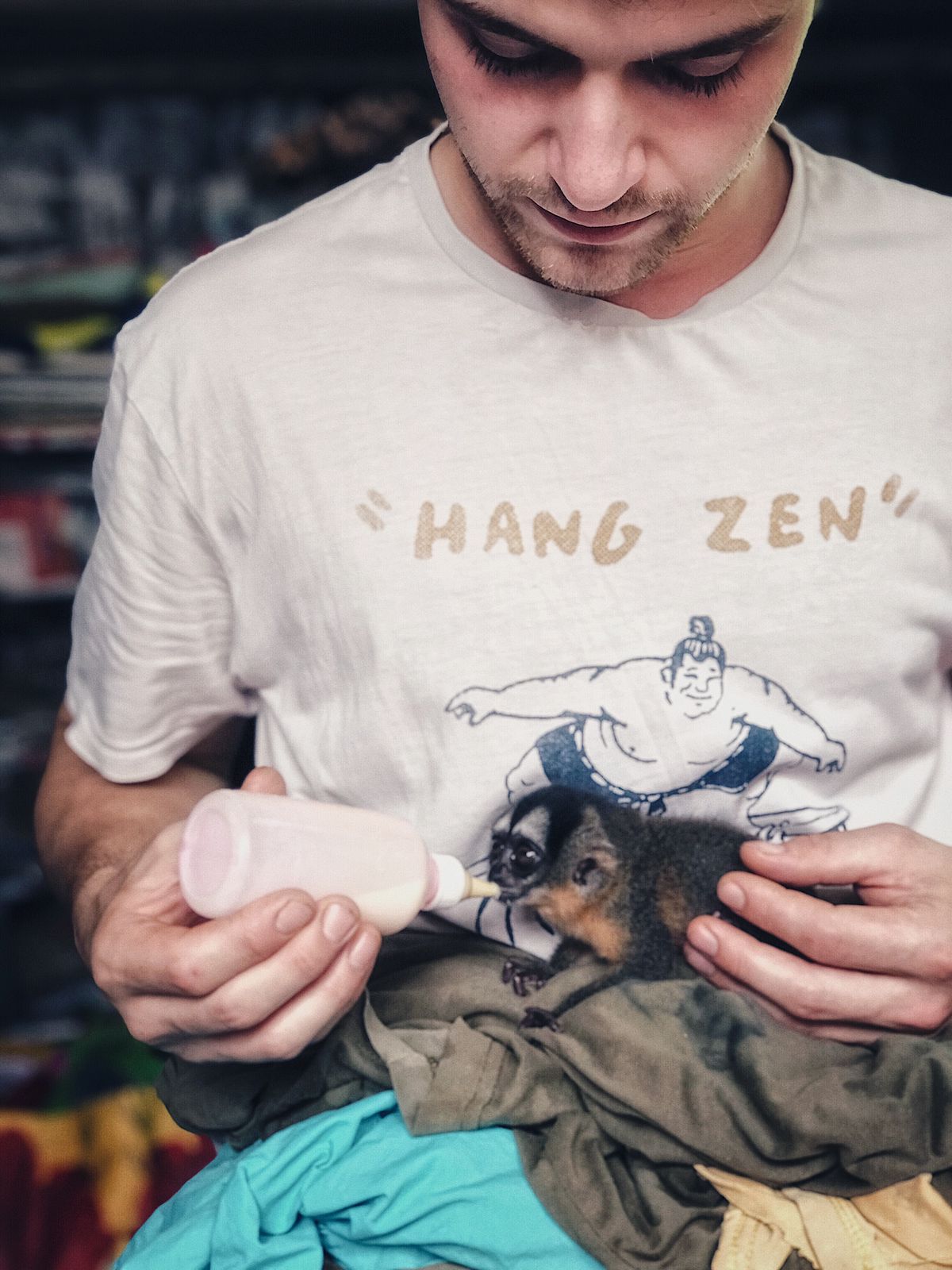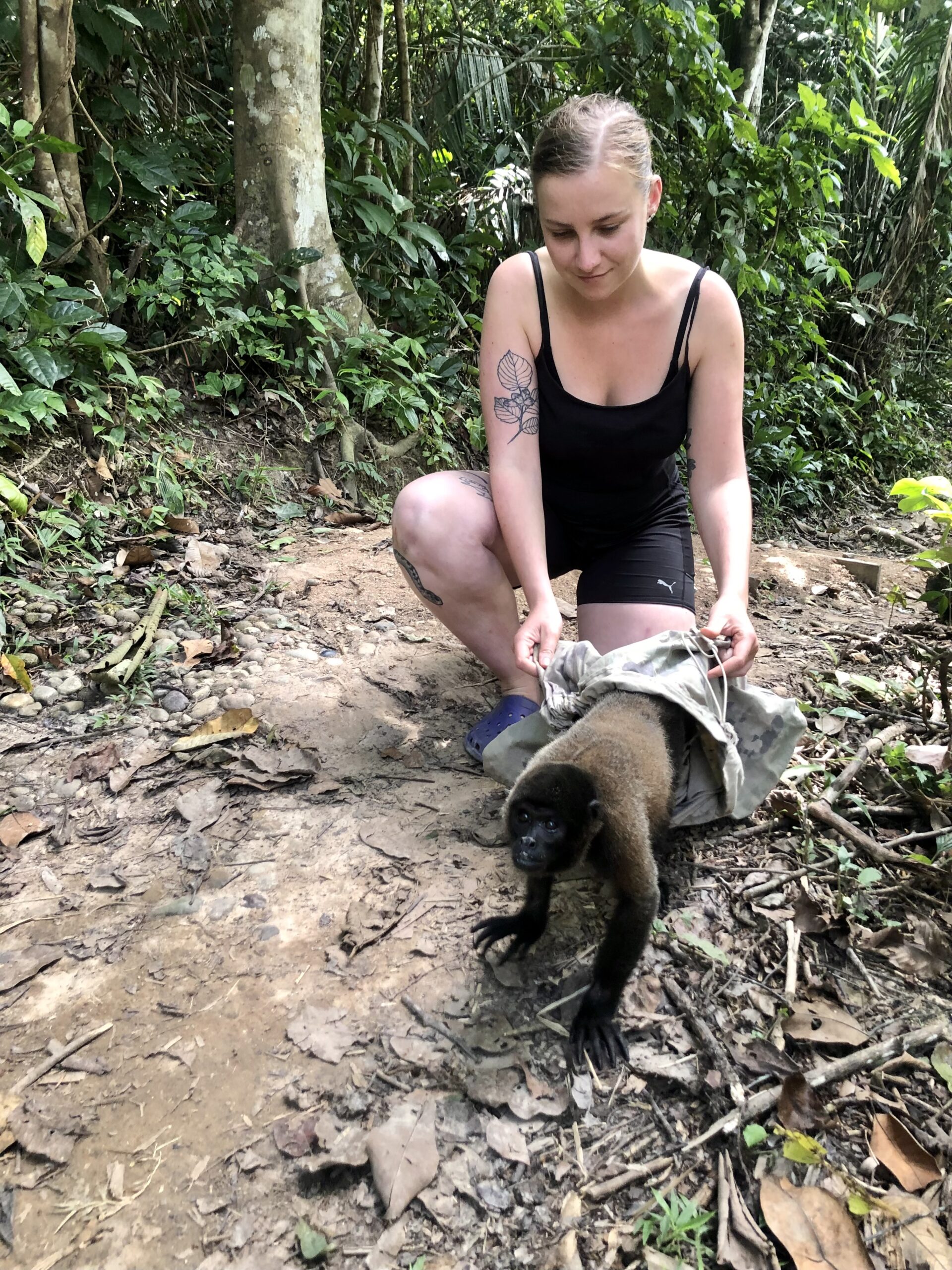 Yuna, the baby female night monkey now spends her days in the clinic, so everybody can help out with the intensive care she needs. Late afternoon Arthur picks her up to return to her cage in his cabin where he can keep an ear and eye on her during the night. It is safe to say that the volunteer team is very happy with this new system, as she is very, very cute.