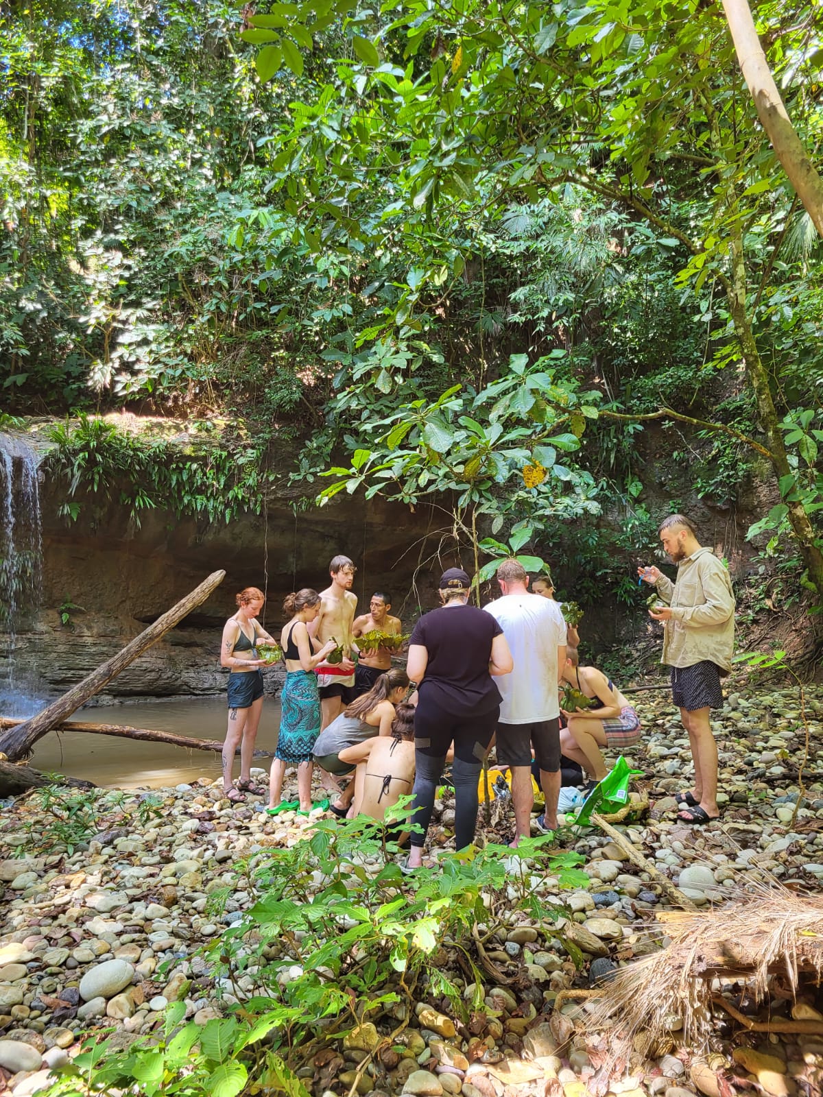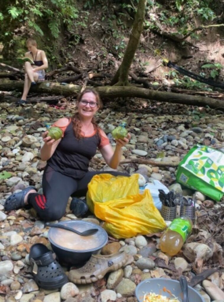 June brings San Juan! On the 24th of June, the saint Jean-Baptist is celebrated by eating ‘Juanes’. It’s chicken, eggs, olives and rice neatly wrapped in a palm leaf. We always eat it by the waterfall and this year while the crew was splashing around, Olivia took on the role of guarding our food from curious coatis.