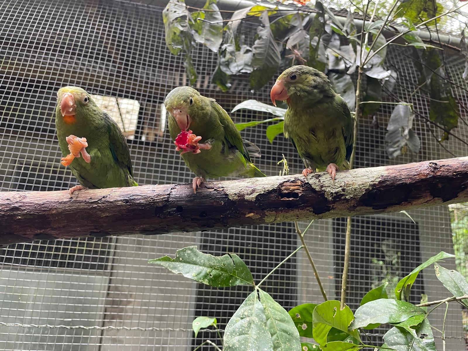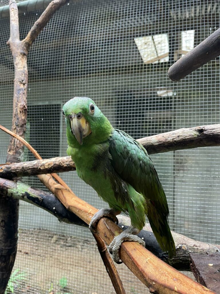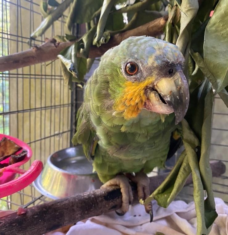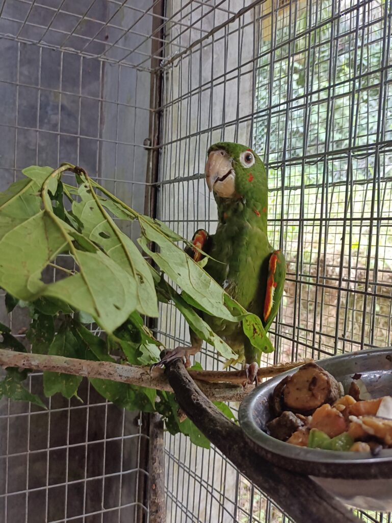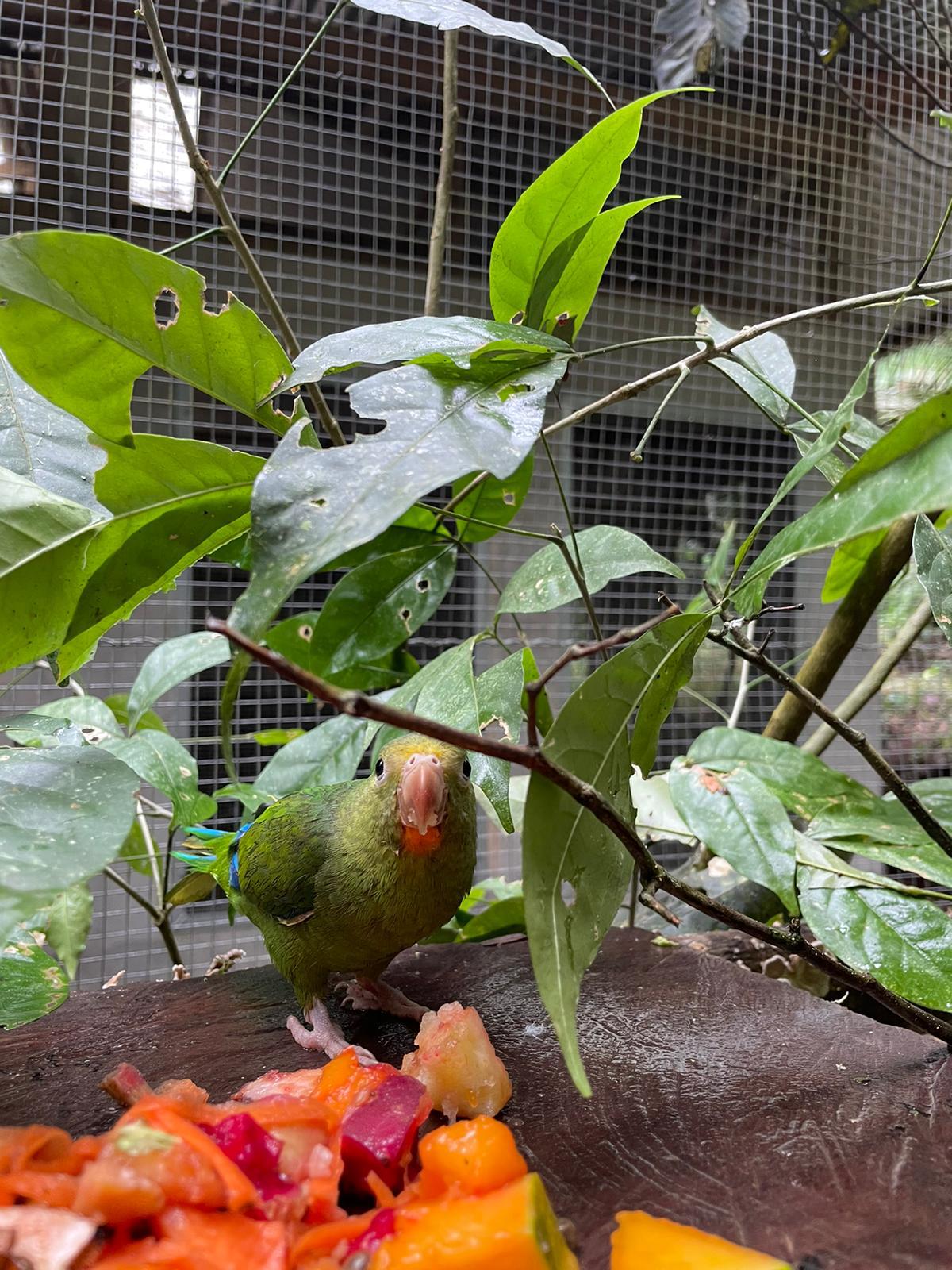 Natzu (blue-headed parrot) was among the new arrivals, but was getting bullied, so we took him to safety in the clinic. Once he’s a fine flyer he’ll move in with the blue-headed parrot gang in the Igor enclosure.