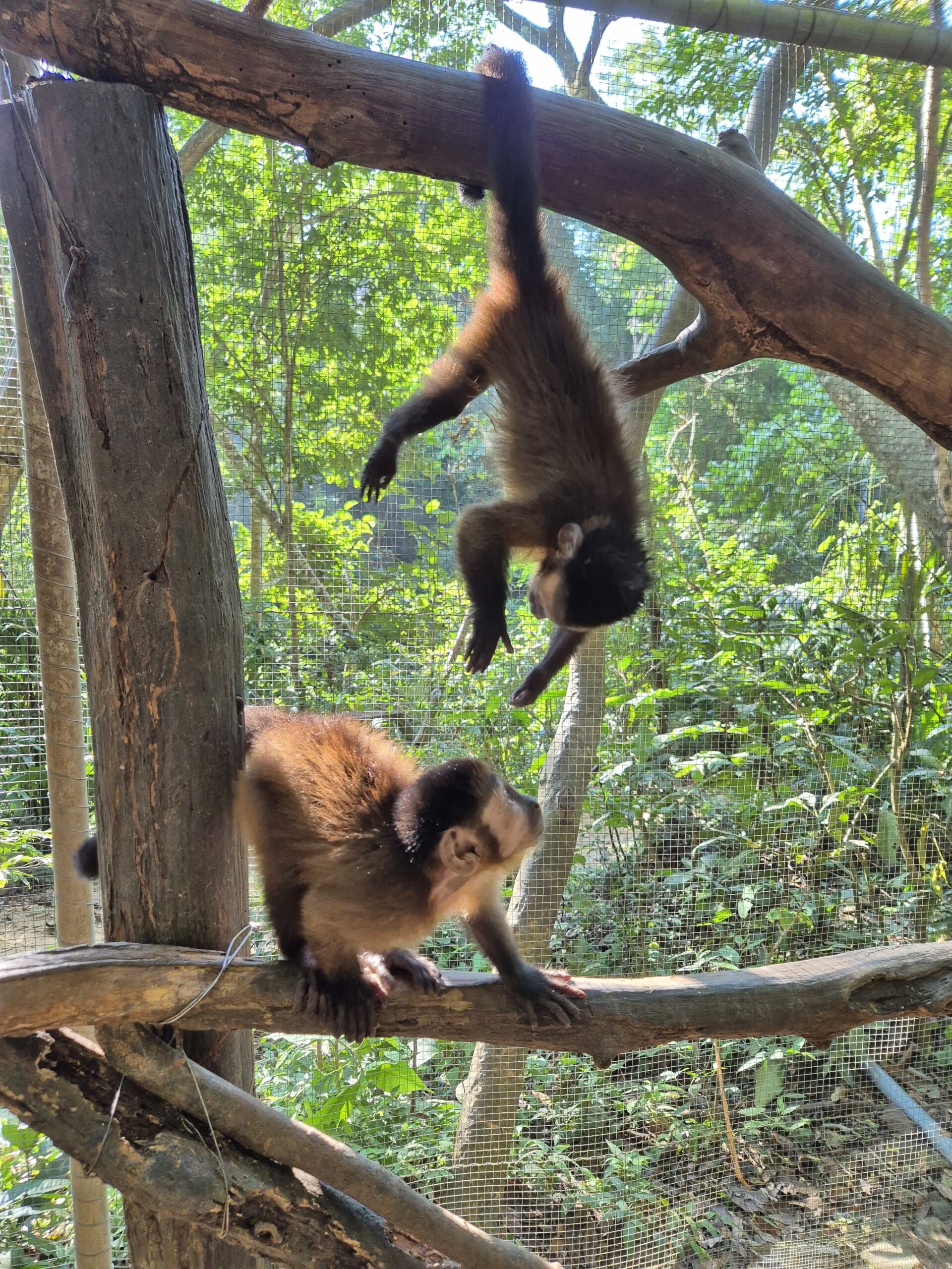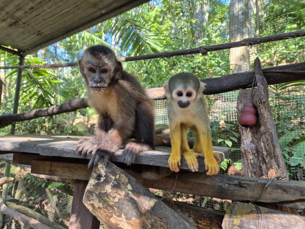 New friendships have blossomed! Young, large-headed capuchins male Kalu and female Shana, along with squirrel monkey Anora, moved out of the clinic to join the slightly older male capuchins Kenzo and Pacco. It took a few days to get used to each other, but since they’re all young, they bonded quickly. The outside group of capuchins pay regular visits, showing them how the social hierarchy works—a big step forward in their rehabilitation and preparation for release.