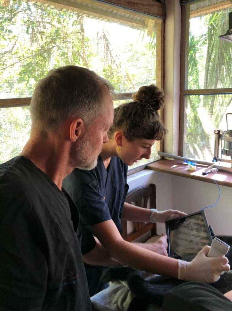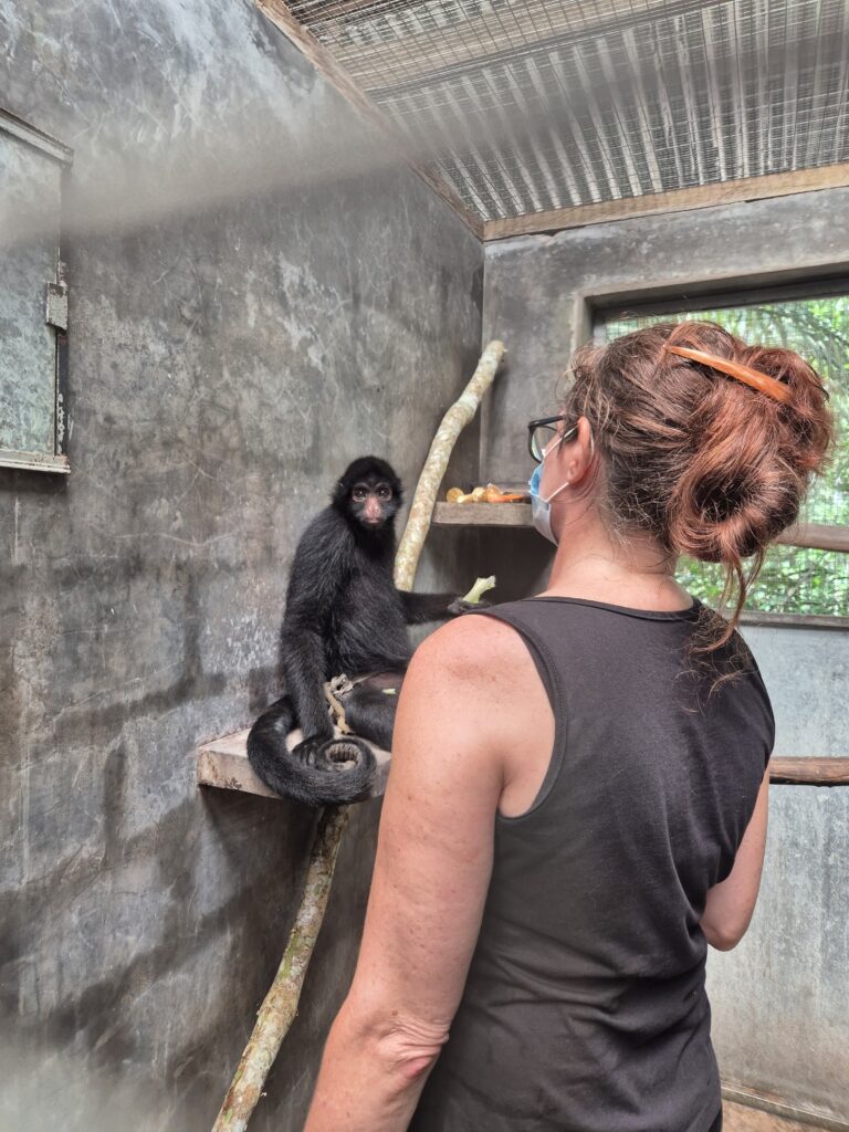 After a few months enclosed with Rimaq and Lucio, adult female spider monkey Katinka was released once all mesh windows were secured (see earlier newsletters). Soon, we noticed her belly growing bigger and suspected pregnancy. She seemed well, but then started bleeding, and her belly shrank. Thanks to an ultrasound funded by our donations to our Dutch foundation, Elja and Douwe confirmed she likely had a miscarriage. We kept her under observation and now she’s happily back outside, causing her usual mischief—like stealing vitamins!