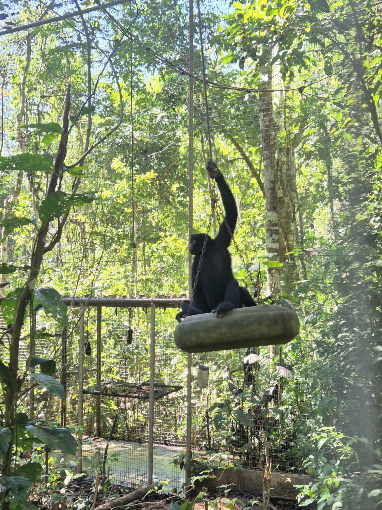 - Female adult spider monkey Lumina, confiscated from a home where she was tied around the waist. After quarantine and treatment, she found two new friends in Lucio and Rimaq in the Rimaq enclosure. With time to adapt and learn spider monkey behaviours, we hope to release her to live semi-freely with the other spider monkeys. She’s thriving with room to climb and swing — no ropes holding her back anymore!