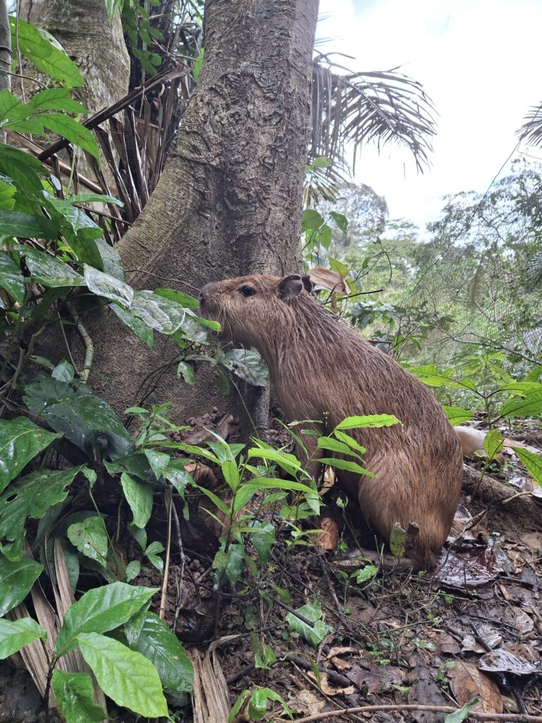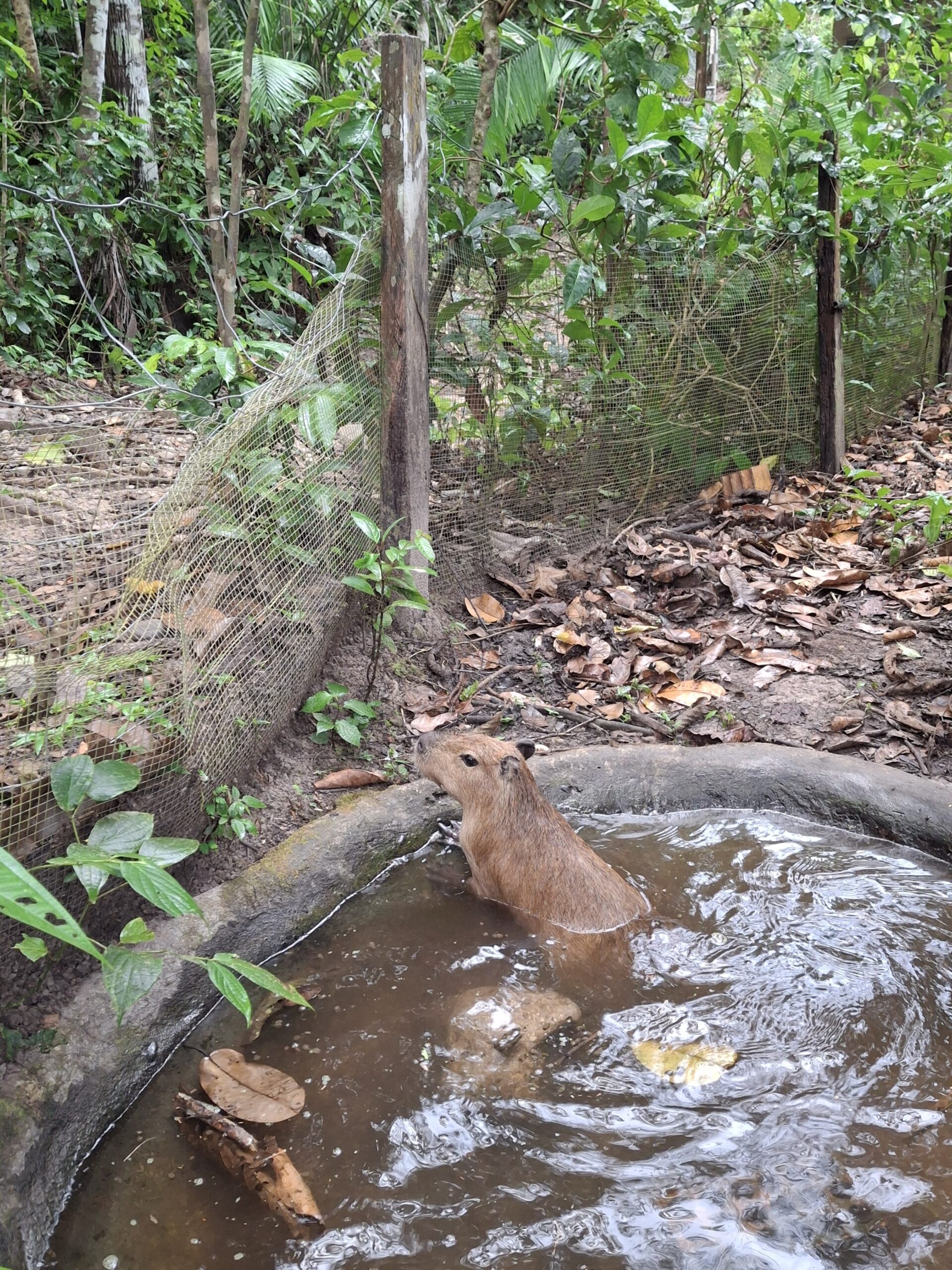 Young female capybara Charra, having eaten almost all the grass in the clinic garden, has grown enough to move to the Momo enclosure. At night, she finds shelter under the cabana, where she enjoys freshly prepared veggies. During the day, she roams freely, munching on leaves and taking regular dips in the pond.
