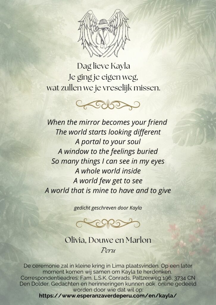 Wat een ontzettend verdrietig nieuws. Ik herinner me Kayla als een heel bijzonder meisje toen ik in 2019 bij Esperanza Verde was. Veel sterkte aan Olivia, Douwe en Marlon.