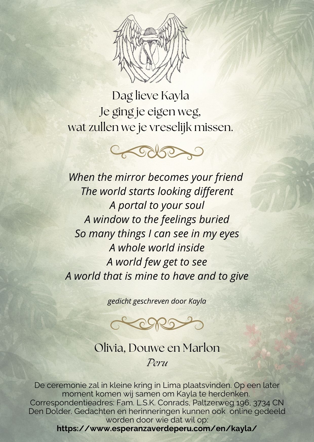 Bedankt voor onze fijne, open en diepgaande gesprekken! Vaak met een lach en soms met een traan. Je was altijd benaderbaar, geïnteresseerd en zo liefdevol. Ik herinner mij jou prachtige lach en krachtige, maar ook liefdevolle blik en houding. Je was filosofisch en zeker ook scherpzinnig. Ik bewonder jou om wie je bent, je eerlijkheid, zelfbewustzijn en waar je voor stond! Zo dapper. Je bent een inspiratie voor vele. Lieve Kayla, ik zal je nooit, nooit vergeten!