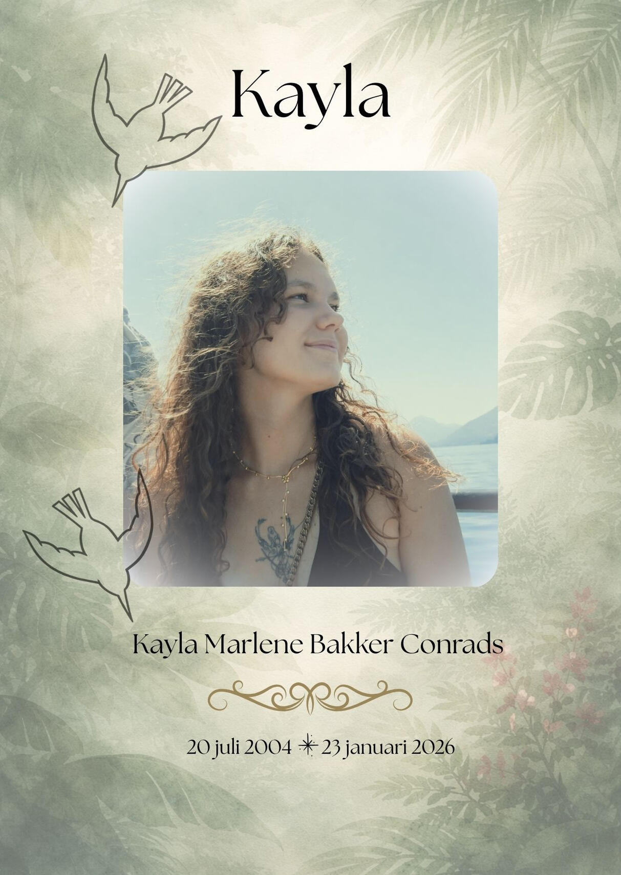 e Olivia, Douwe, Marlon en iedereen die Kayla zo lief had, gecondoleerd met dit onmetelijke verlies. Wat afschuwelijk. Ik leerde Kayla in 2017 kennen op een bepalend punt in mijn leven als vrolijk, heel bijzonder meisje dat ongelofelijk goed in bomen kon klimmen en zó dol was op dieren. Toen een tapir stierf ondanks al onze inspanningen om hem beter te maken, was ze ontroostbaar. Ik vond het indrukwekkend en inspirerend hoeveel binding ze met de natuur om haar heen had, iets dat we in de Westerse wereld nauwelijks meer kennen. Daarna volgde ik haar op de socials en vond het zo dapper hoe ze zelfstandig navigeerde door de wereld en de wereld in trok om een leven te maken voor zichzelf. Het is dan ook intens verdrietig om te lezen dat die wereld haar heeft opgeslokt en niet kon bieden wat ze zo erg nodig had. Een groot gemis dat Kayla, een prachtige ziel op aarde er niet meer is. Ik wens jullie heel heel veel sterkte bij dit ondragelijke gemis.