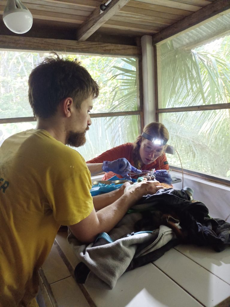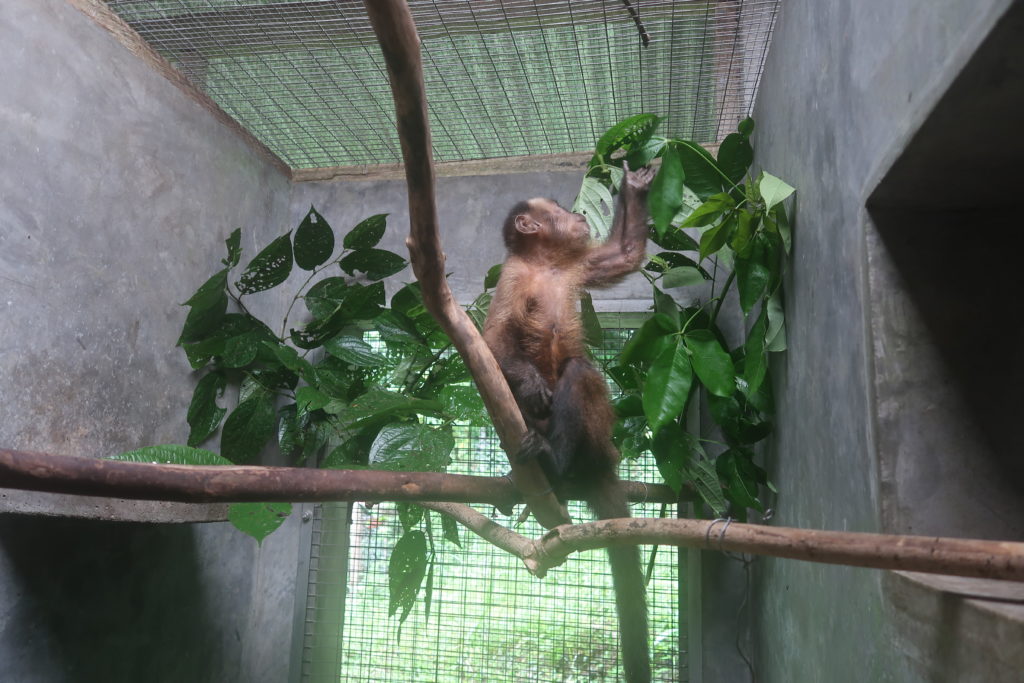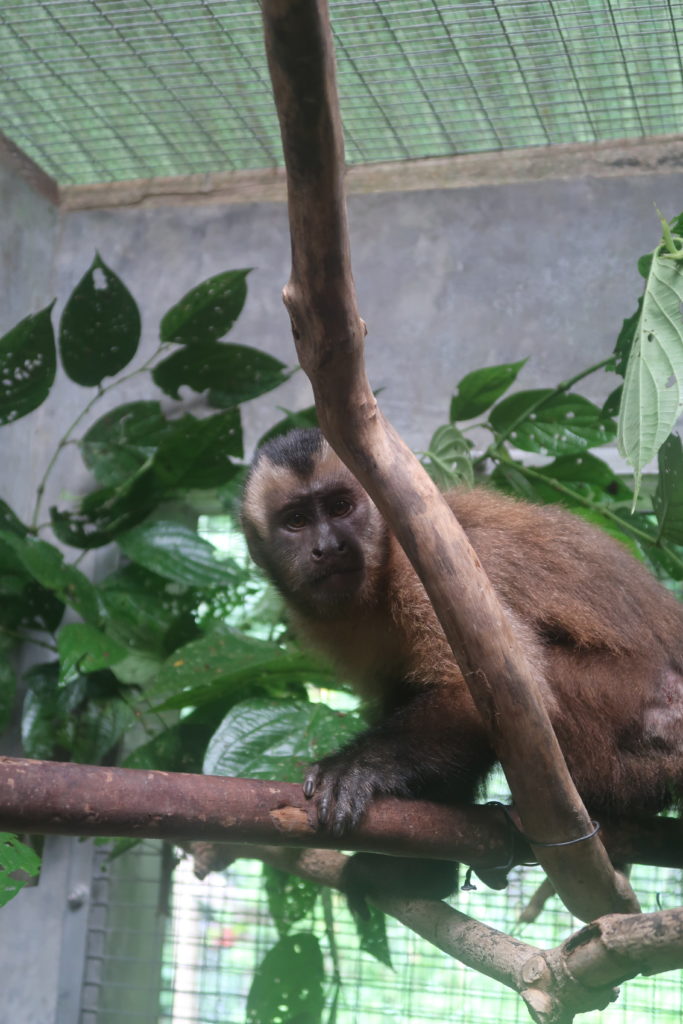 At the end of the month, Biko (adult male large headed capuchin) made a trip to the SUSTOAH after sustaining some wounds outside. Volunteers heard some capuchins fighting high up in the trees and shortly after discovered that Biko was injured. The wounds were cleaned and had to be stitched up. He will now remain in the clinic to receive further care and will return to the outside soon, where we are confident, he will resume his usual mischievous behavior.