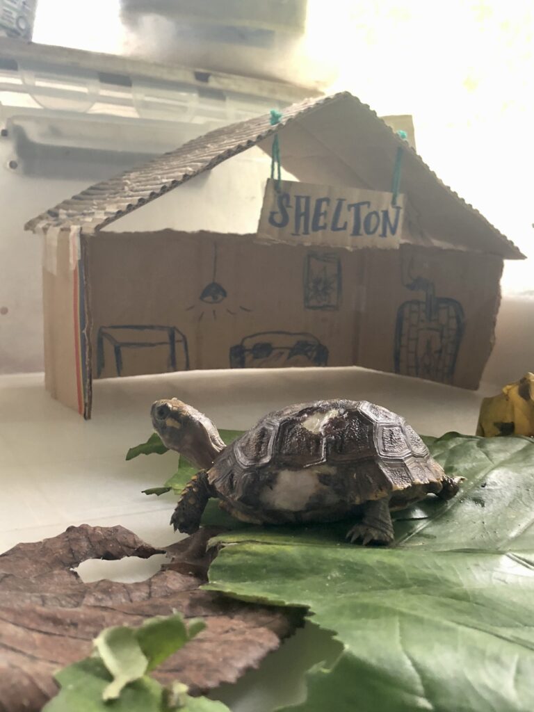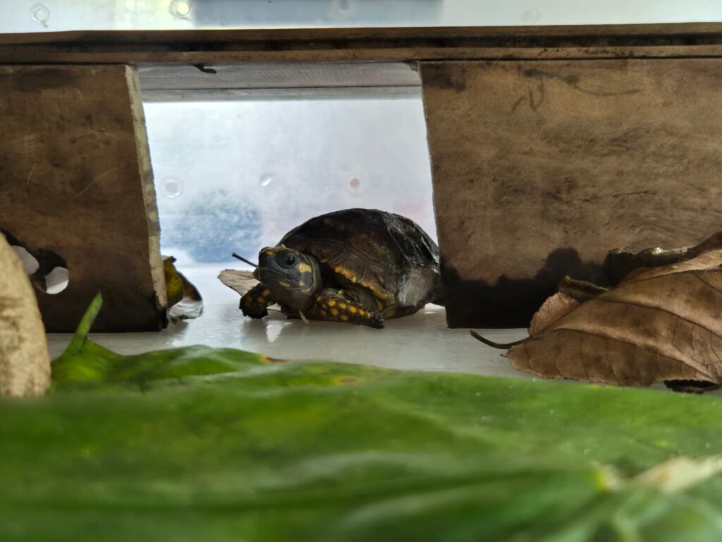 Small yellow-footed tortoise Shelton John was part of an earlier release. He was found with pieces of his shell missing, and was admitted to SUSTOAH. He is still very young and healing will take time, so he will be in Clinic for a while. He gets a lot of TLC, volunteers even made him a cozy little house!