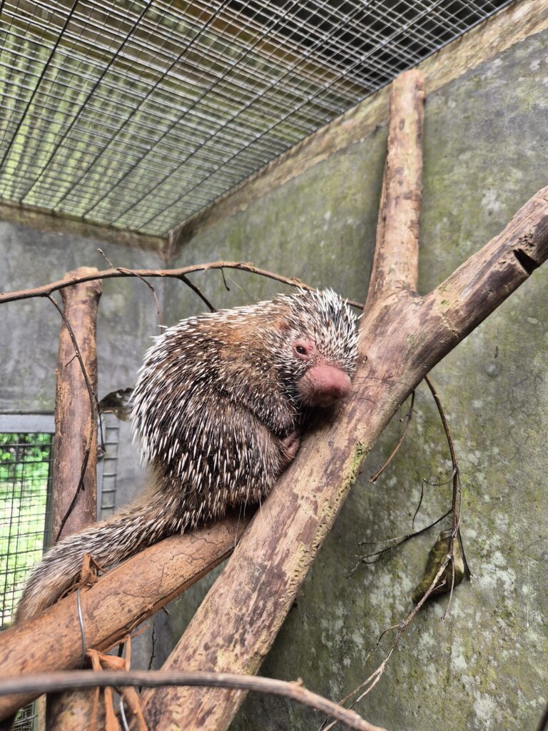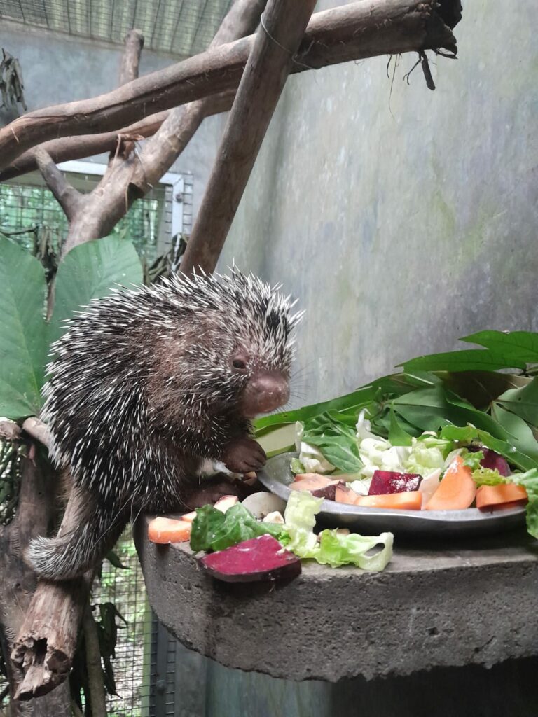 We welcomed new arrival Astilla, a female tree porcupine. She was found near a city in the area and brought to us by the Ministry of Flora and Fauna. She appears to be a wild animal and prefers to keep her distance from humans. As she is still young and not yet able to survive on her own, she will remain with us until she is ready for a release back into the jungle.