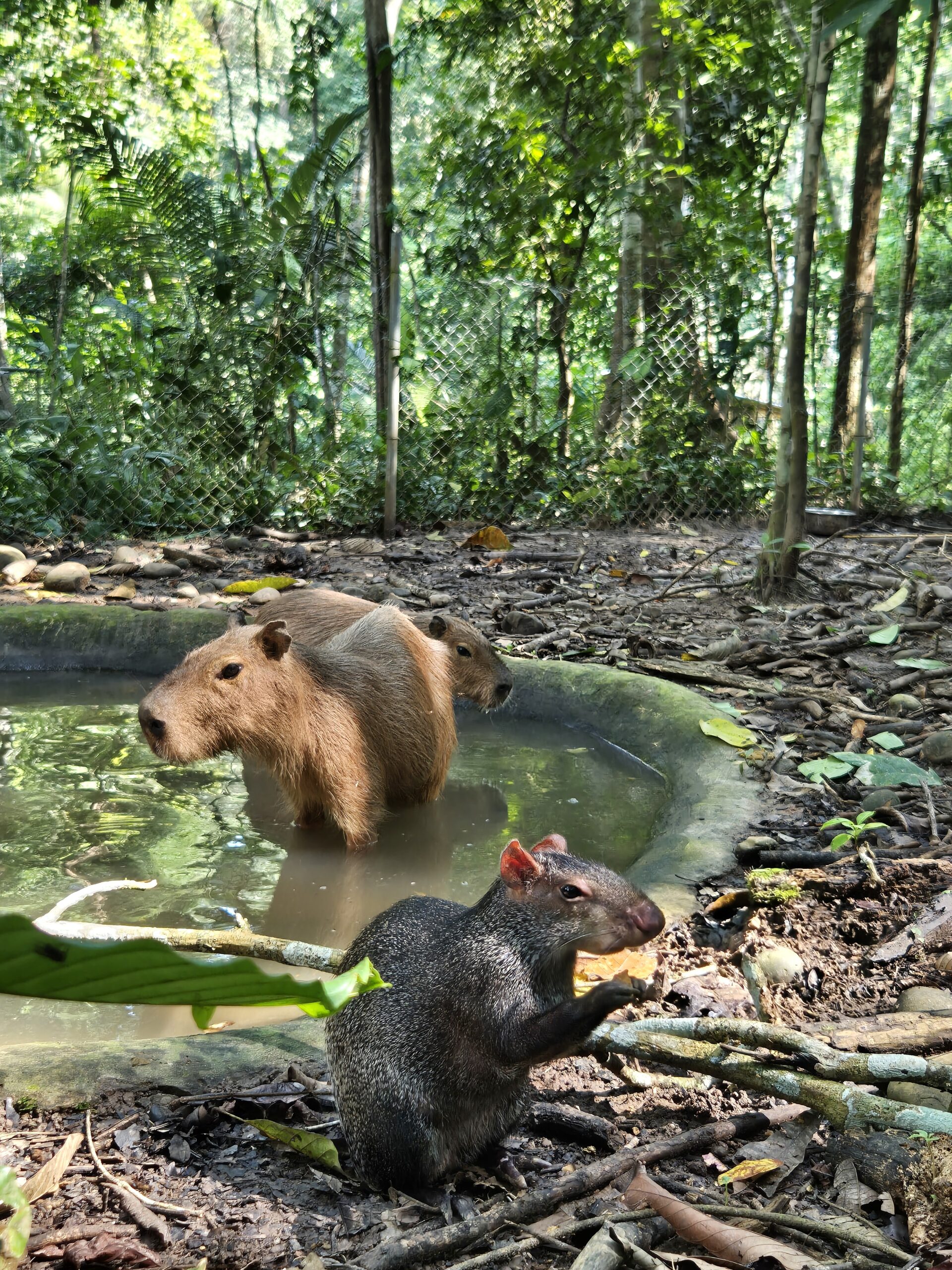 Capybaras Basco and Charra moved in together! Basco has been with us for several years, while Charra joined us a year ago, only a couple months old. Now that she has grown big and strong and Basco’s health has finally improved, it was time for them to meet! After a slightly hesitant start, they quickly began eating and swimming together. All under the watchful eye of agouti Kampari, who has been living with Charra for a while now.