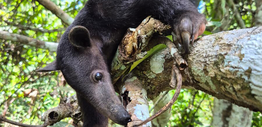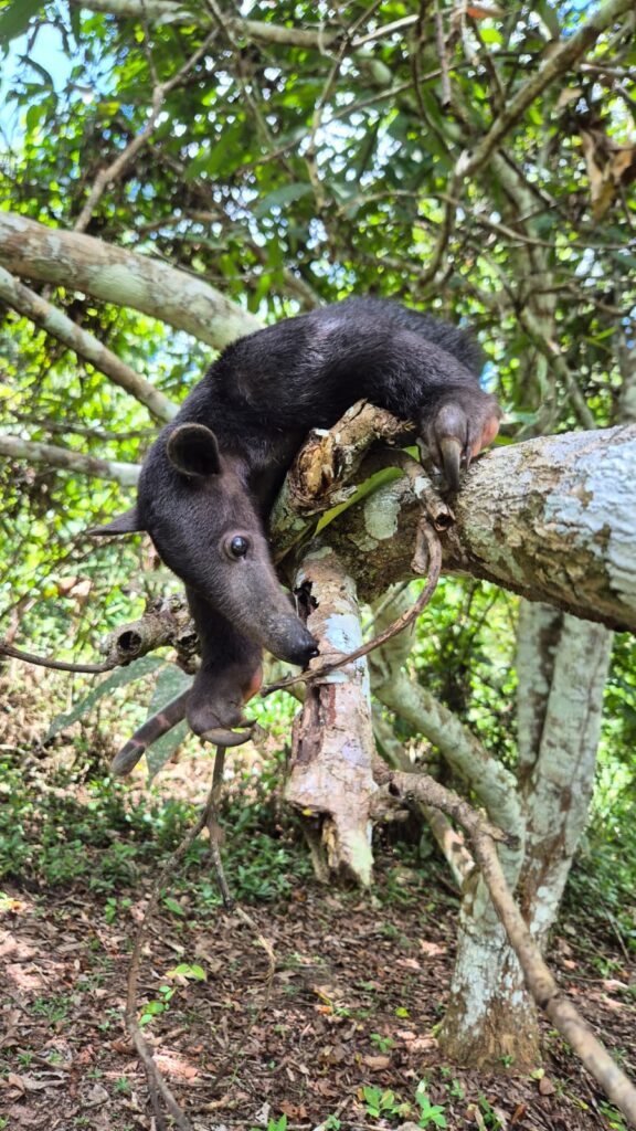 Southern tamandua Nakini is doing really well! She arrived just a few weeks old and required intensive care. She grew stronger every day and is now ready to explore more of the outside world. Twice a day, volunteers take her on a termite walk, where she climbs trees and eats her tummy full with delicious fresh termites. After that, she can relax in the outside enclosure Tika, from where she will be released in the future.