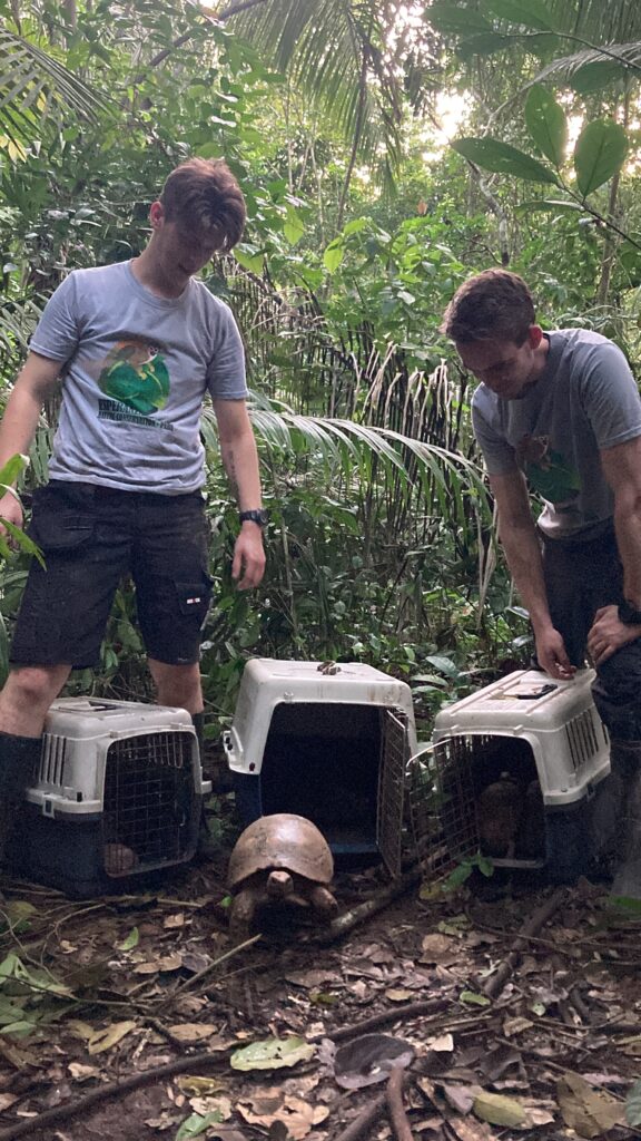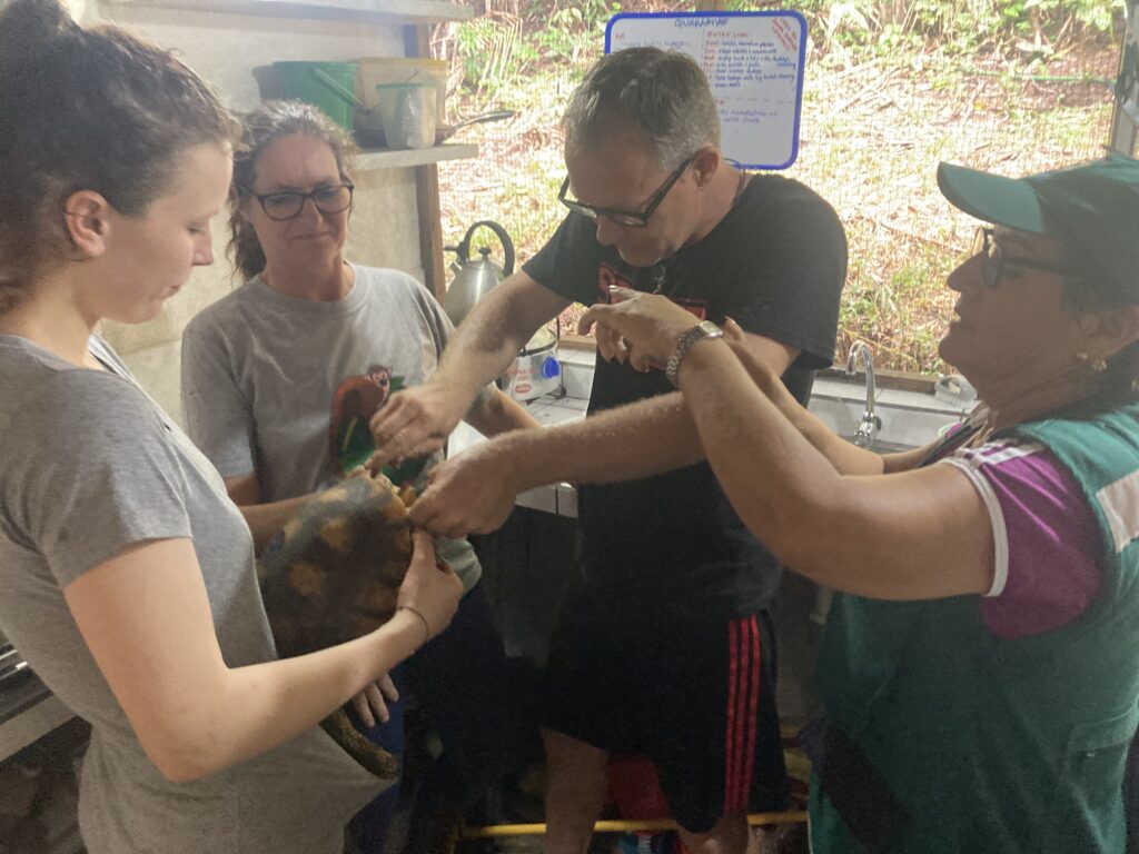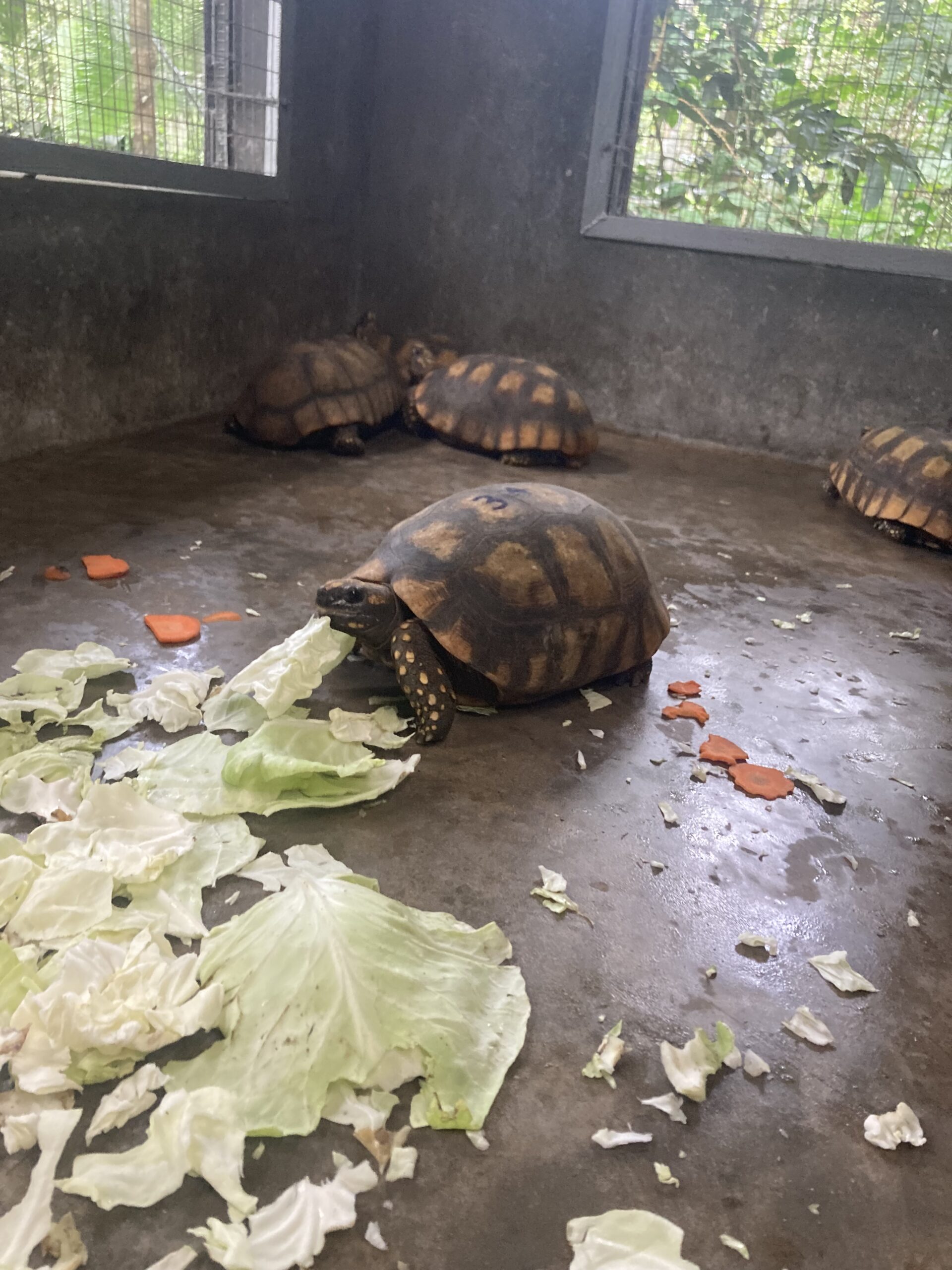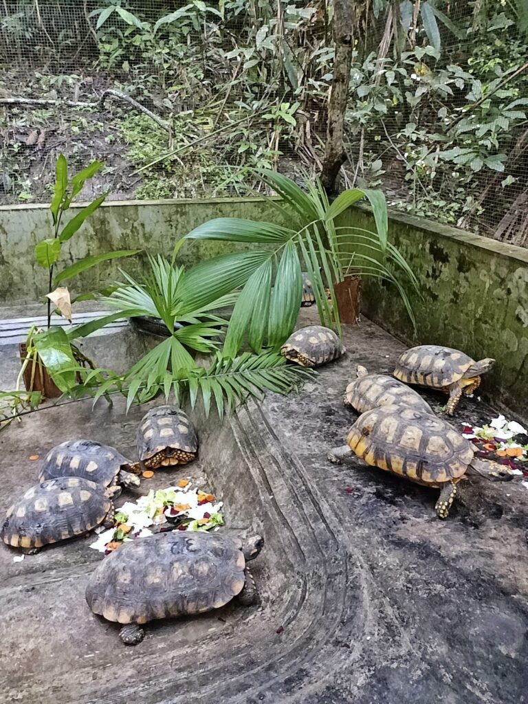 he Ministry of Flora and Fauna rarely arrives empty-handed, and this time was no exception. We welcomed a staggering 65 yellow-footed tortoises at an average of six kilo each (who needs the gym?). A journey that involved traveling by car, boat, and many helping hands. We had to make the most of our quarantine space to accommodate the new arrivals. Our amazing vet team got busy checking their faeces, deworming them, weighing, and measuring them, and inserting microchips for identification. They also had the exhilarating job of getting rid of ticks! The tortoises are doing great in our care, getting regular food and attention. These incredible creatures were saved from being sold for meat and now have a second chance at freedom.