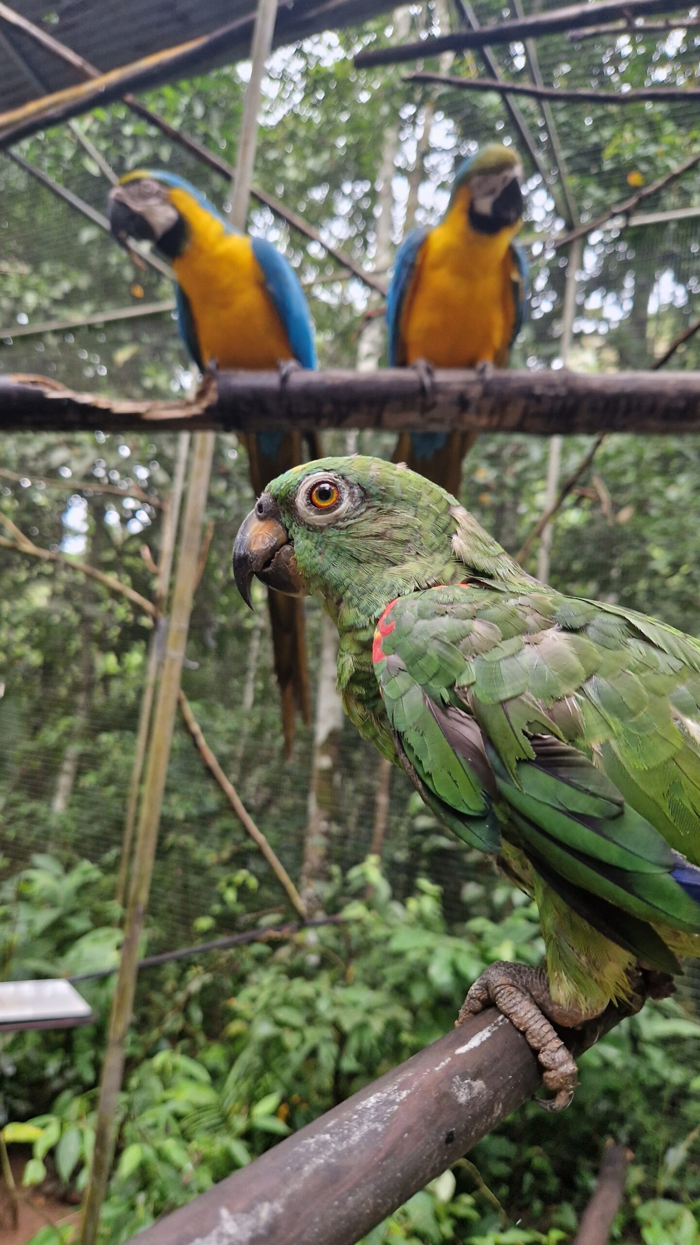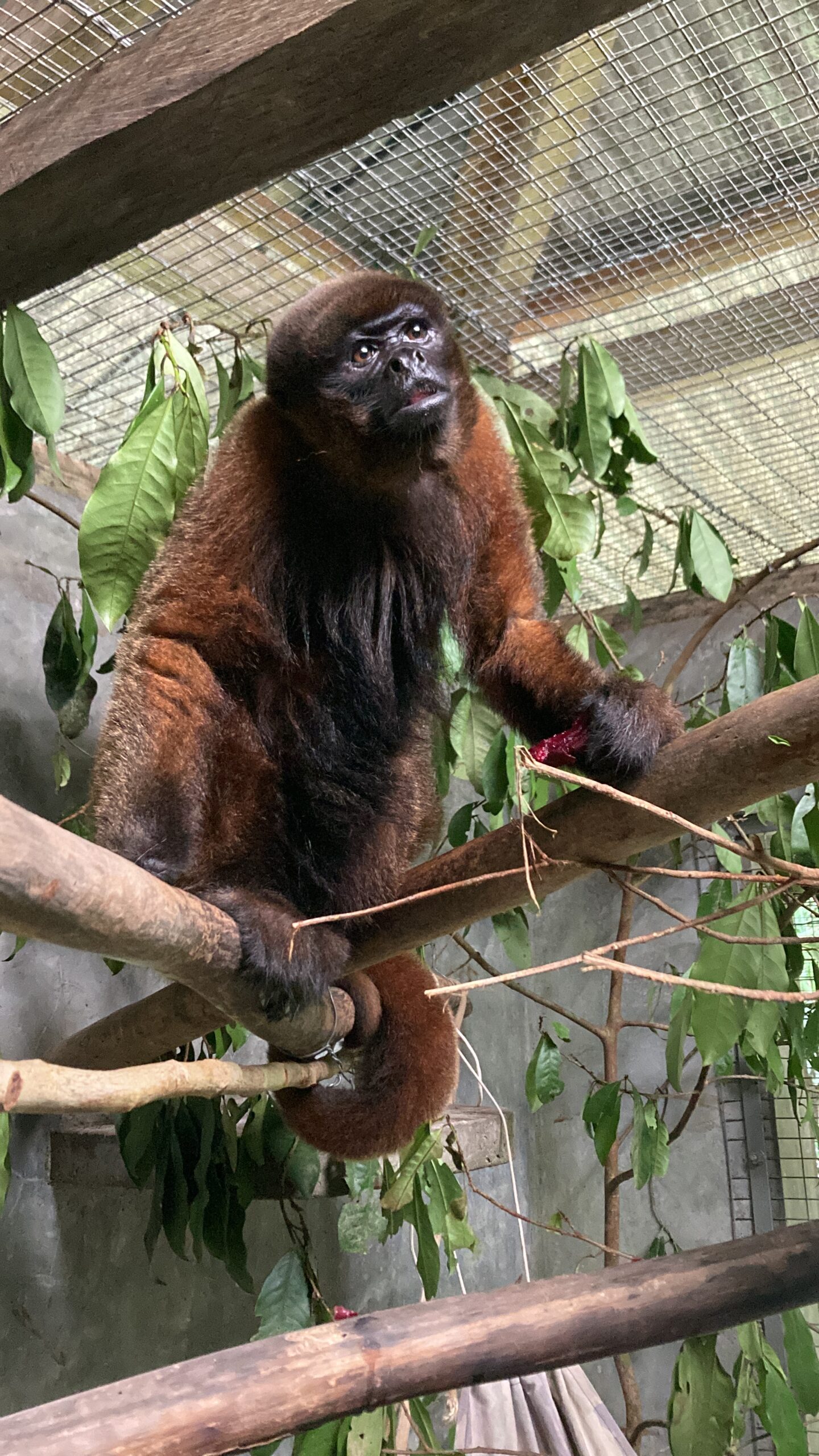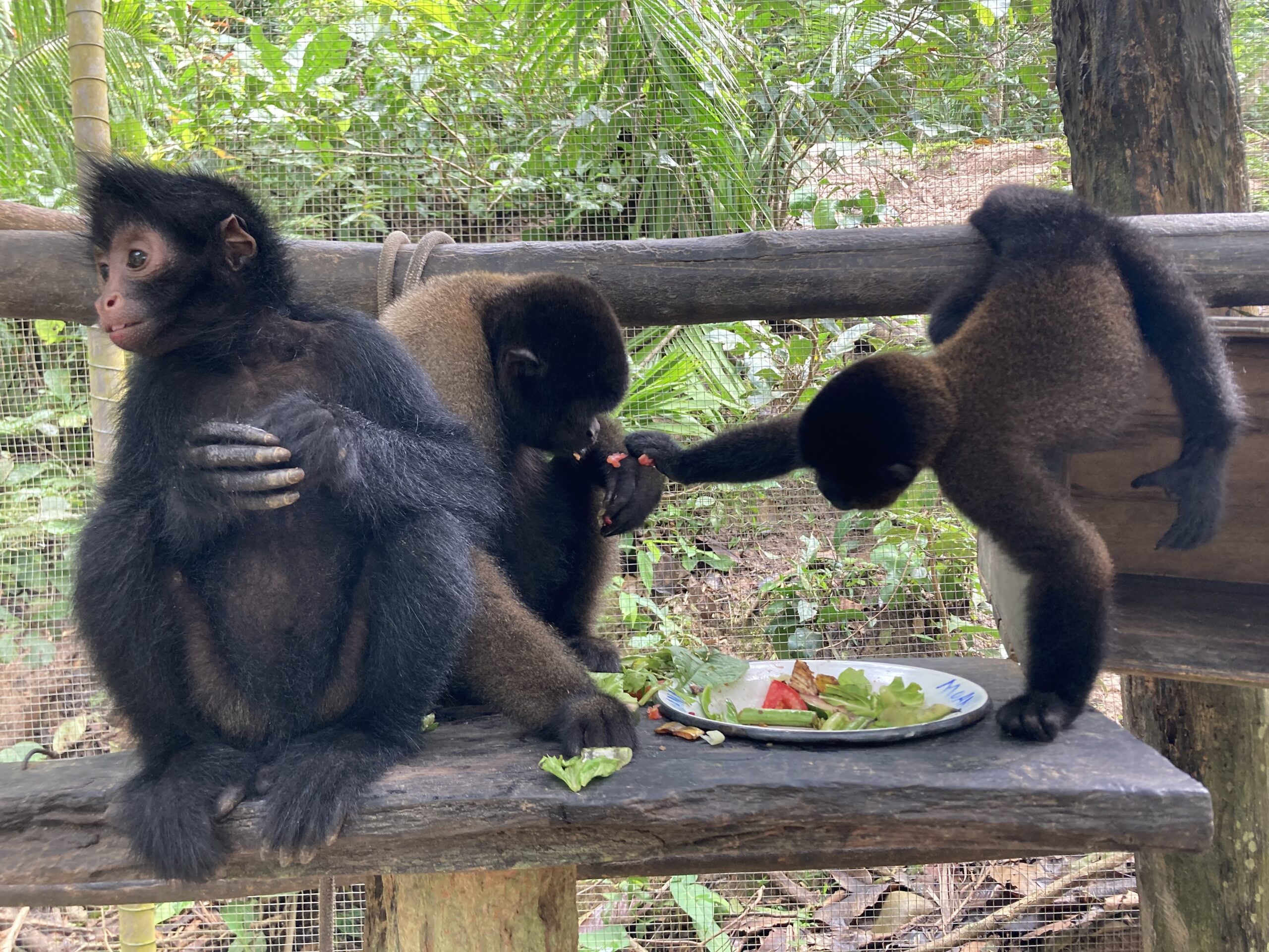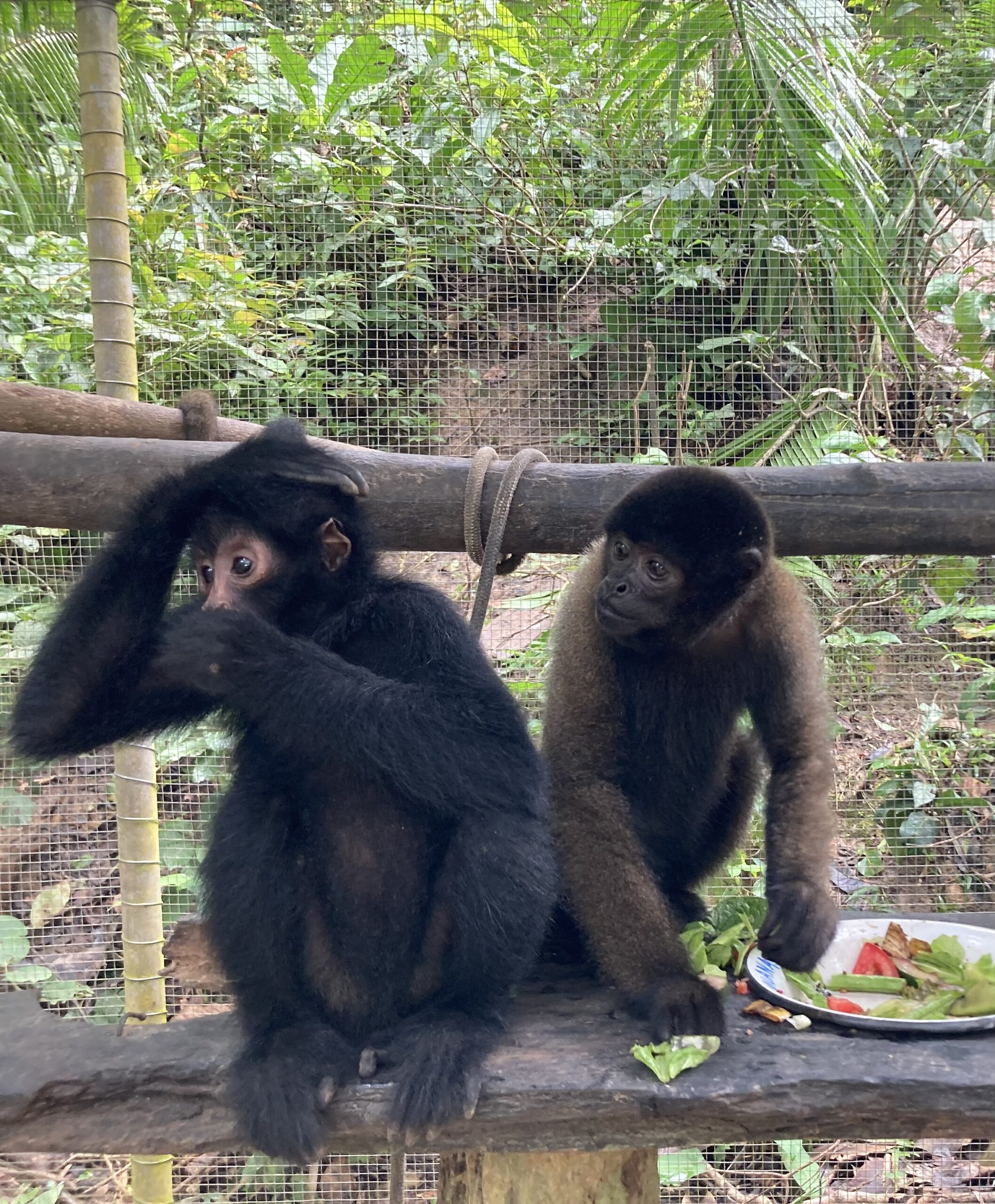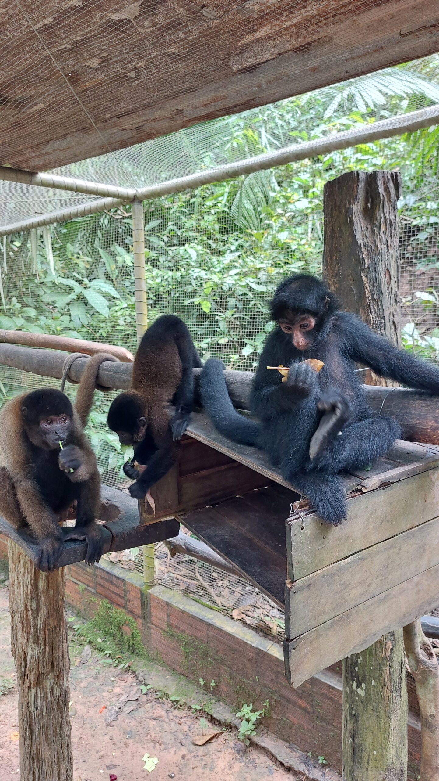 Moana (juvenile female woolly monkey) wasn’t herself either. Given her young age, she now spends mornings and nights in the clinic being monitored. After breakfast she joins Juanita and Noa in their outside cage for the day. She seems to be getting back on track, tentatively playing with mischievous Noa and steeling food from Juanita.