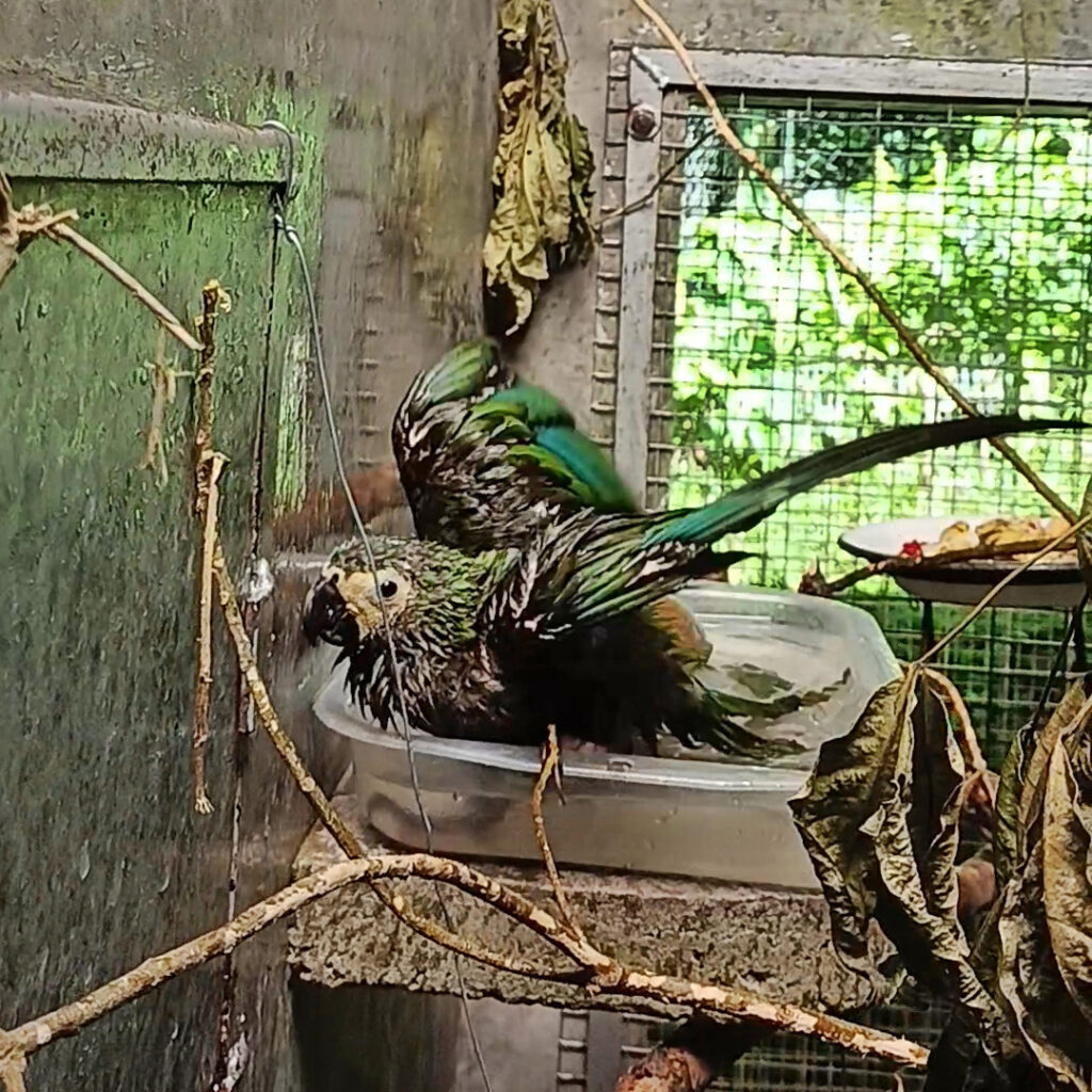Papilo (red-bellied macaw) is enjoying the latest addition to his quarters – a petite paddling pond. Hopefully, he doesn’t get too attached to it, as he did take his first flaps in front of us, indicating he’ll soon be fit for flying in an outside enclosure.