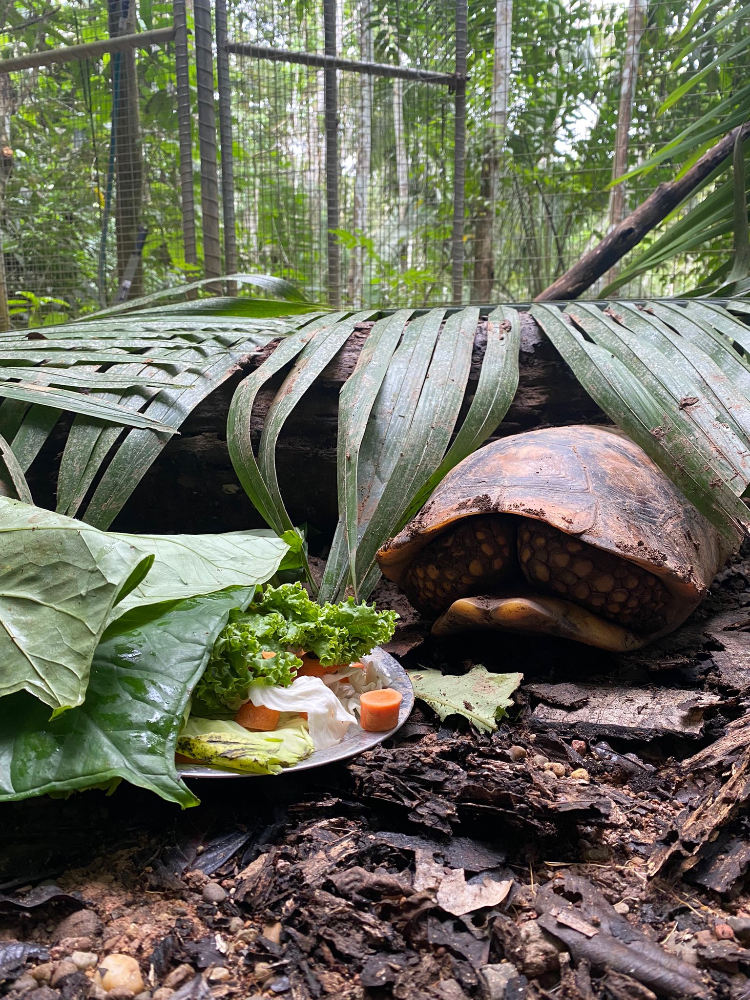 Nintendo (yellow-footed tortoise) upgraded to an outside reptile enclosure, deep in the forest far away from the quarantine’s capuchin sounds. If he could talk, he would probably thank us – you’re welcome, Nintendo!