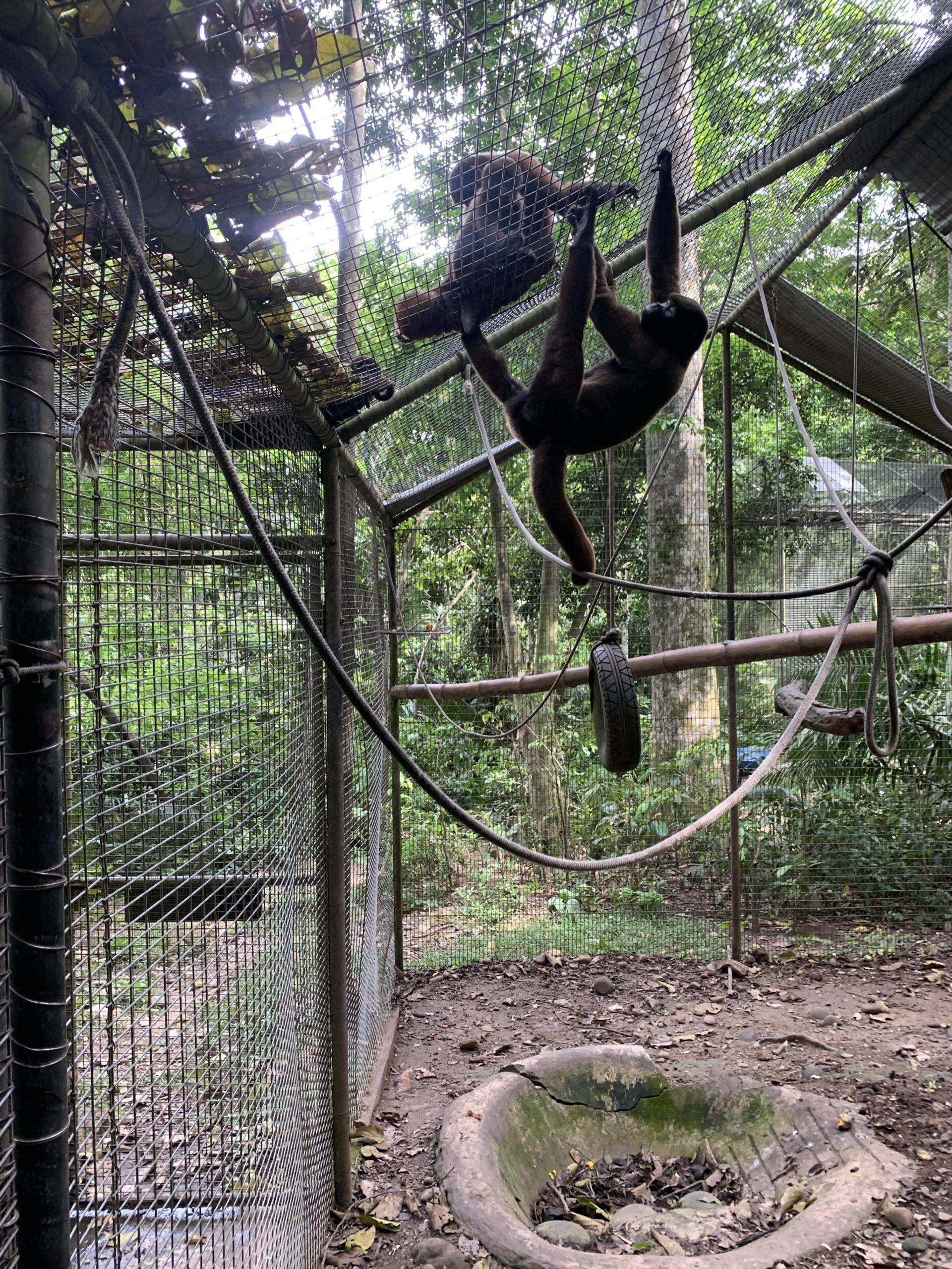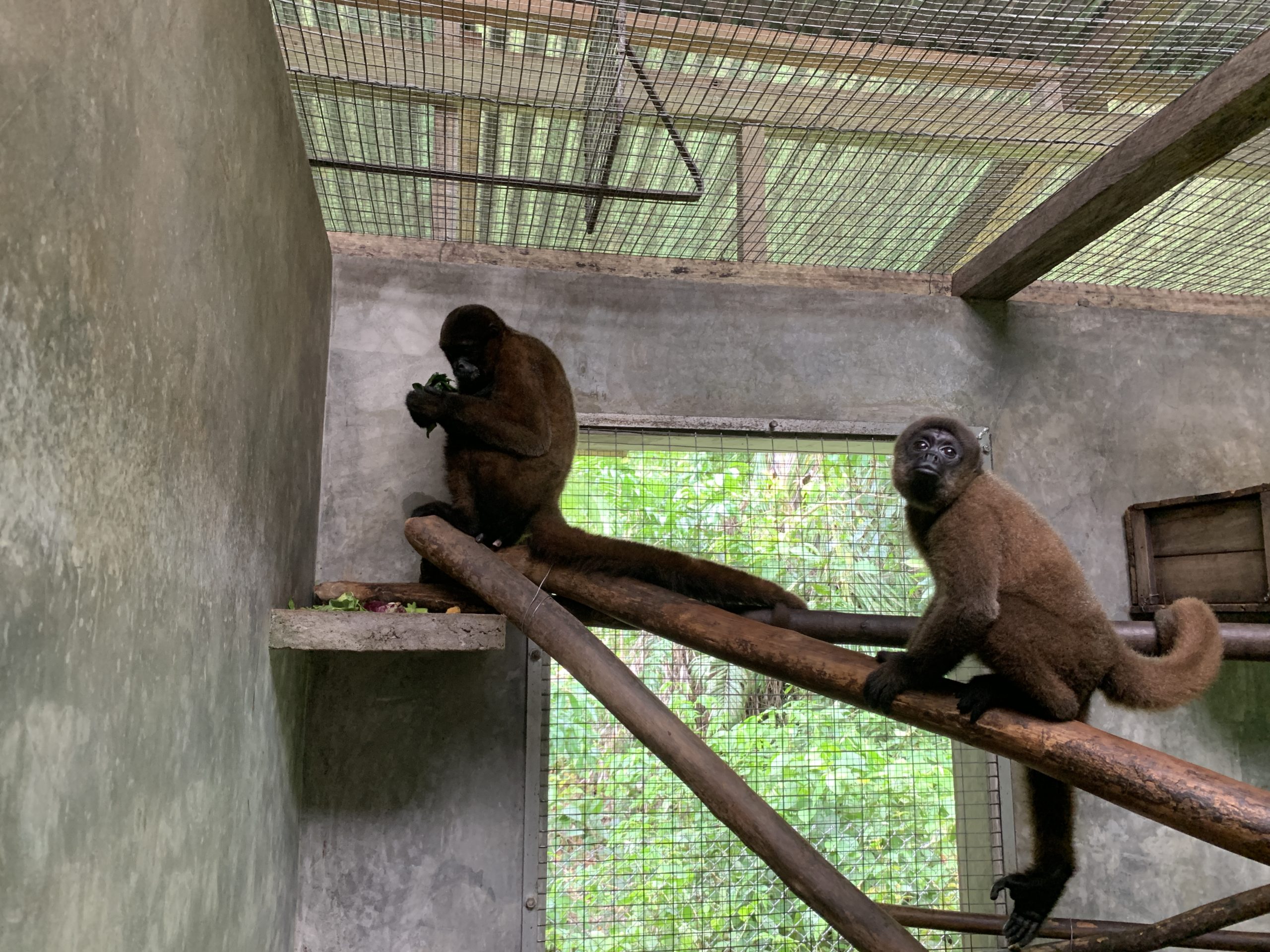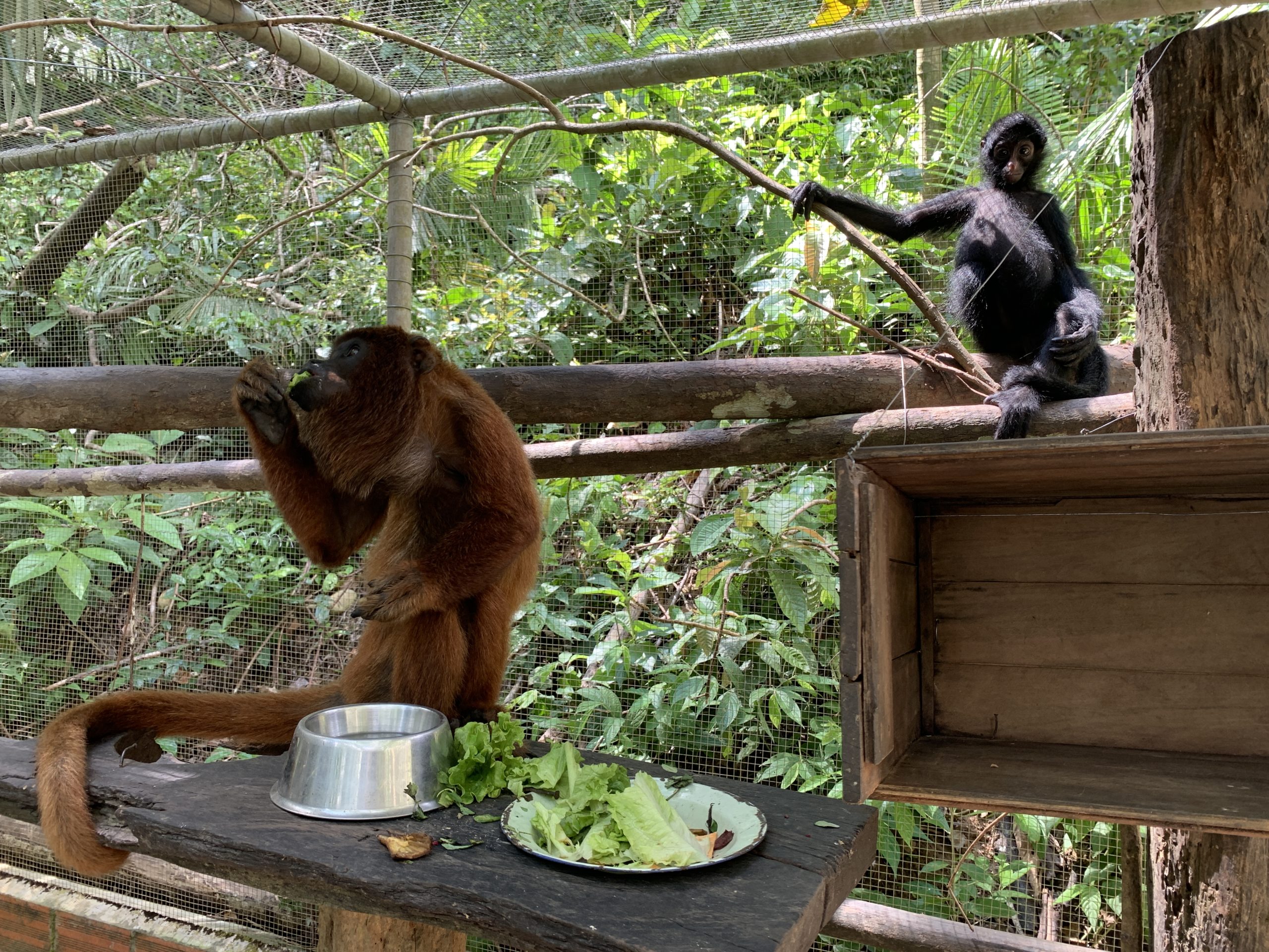 Ashuke the spider monkey and howler monkey Darwin in Lulu cage