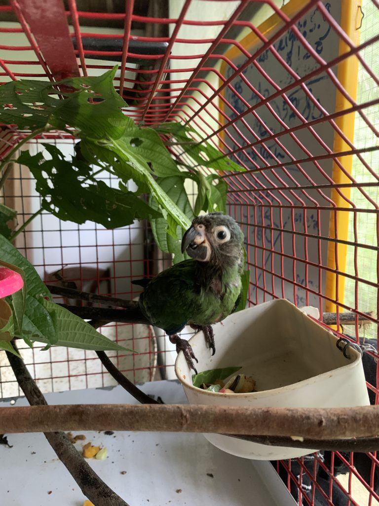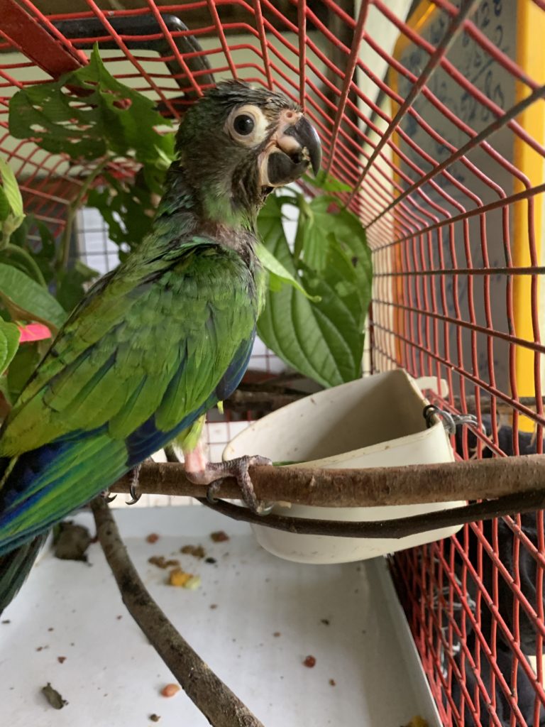 With the visit of the Ministry Asuki a young fledgling dusky headed parakeetarrived. His life started as a pet in a local family, but soon they noticed that even a small bird like this is not always easy to take care of. He is a bit skinny and will be staying in the clinic, receiving some extra vitamins and sufficient attention.