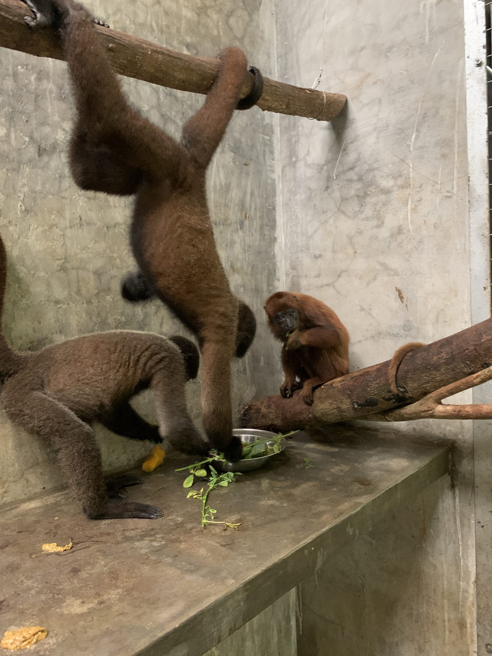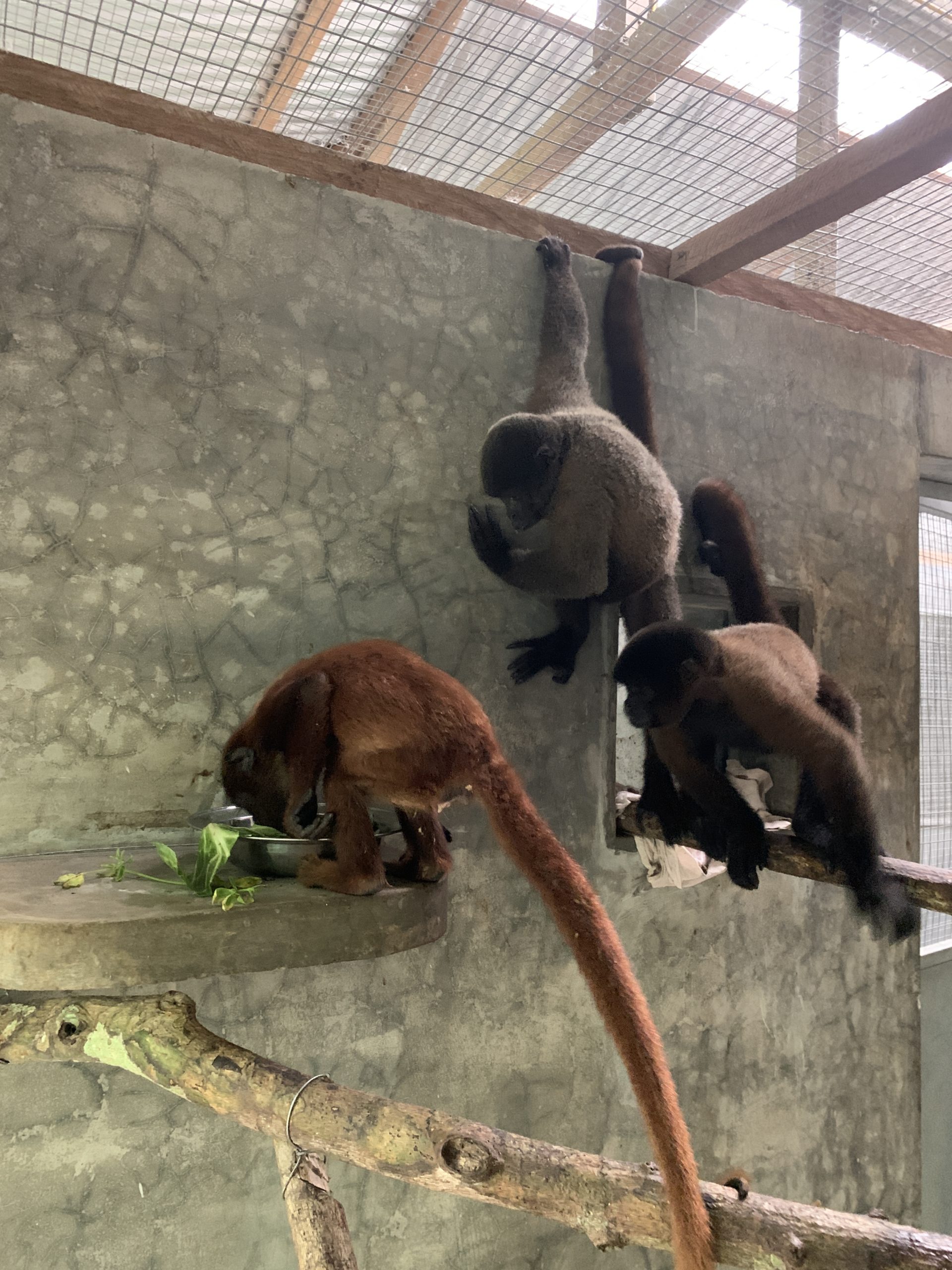 Woolly monkeys Tasha and Keska waiting until howler monkey Maida has taken her share
