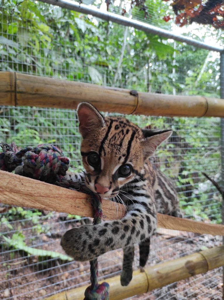 Gaia, the young female ocelot, made the big move from the family house to the newly completed Wayra enclosure (named after our first ocelot). Gaia is still young and in the wild would still be highly dependent on her mother. Unfortunately, being taken away too young and being raised by humans she will never learn sufficient hunting skills to be able to survive in the wild. So, for now we will compensate the loss of her mother by not applying the no-touch policy, and volunteers are able to interact with her directly. Of course, quickly she has become a volunteer favourite. As Gaia gets bigger and more unpredictable our “no touch” policy will come into force again, safeguarding both volunteers and Gaia from unnecessary stress and possible injury. Plans are already in progress for a new larger purpose-built feline enclosure encompassing residence for the two margay Grety and Diego as well as the two ocelots Gaia and Wayra.