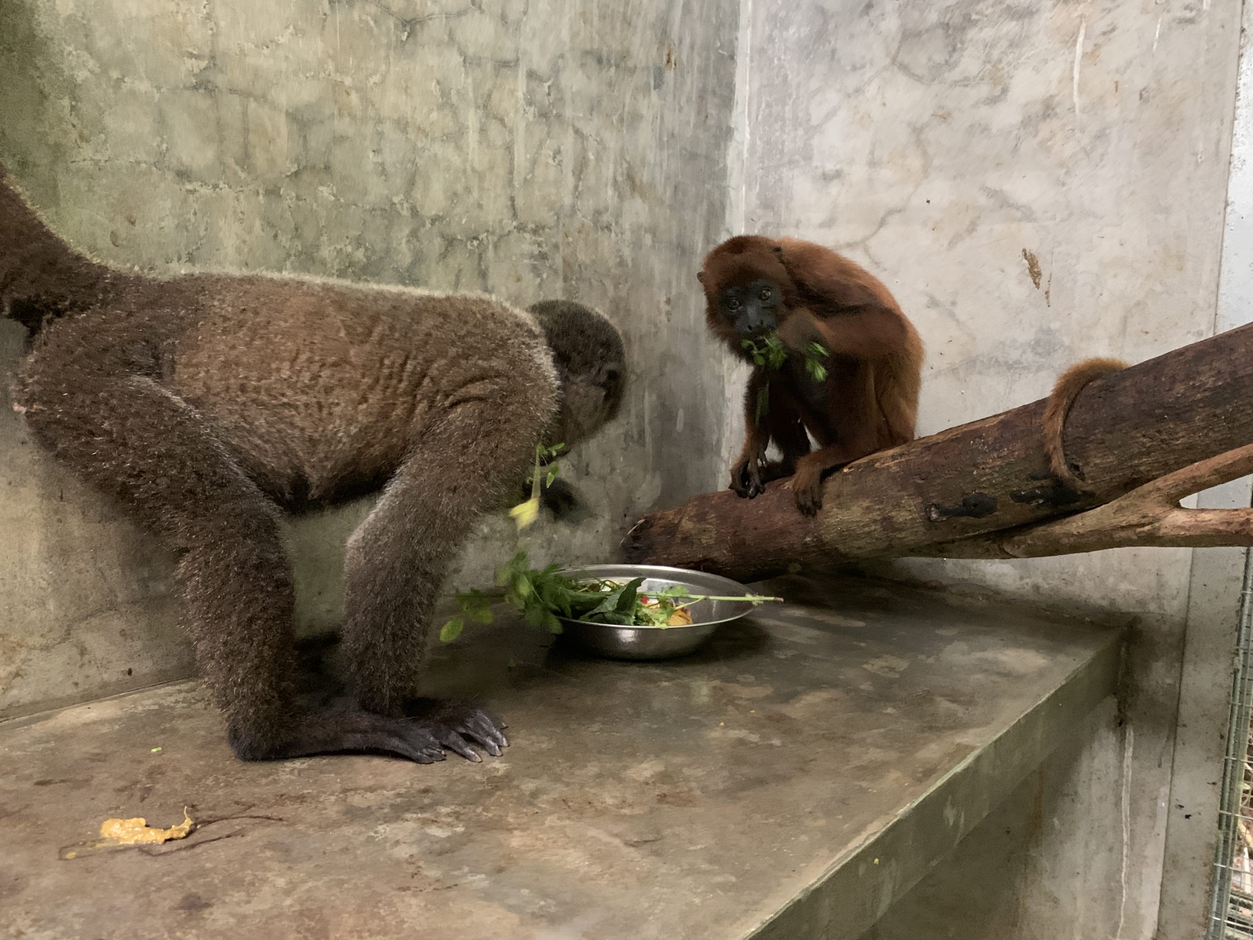 Howler monkey Maida and Keska the female woolly monkey enjoying some alfa-alfa leaves