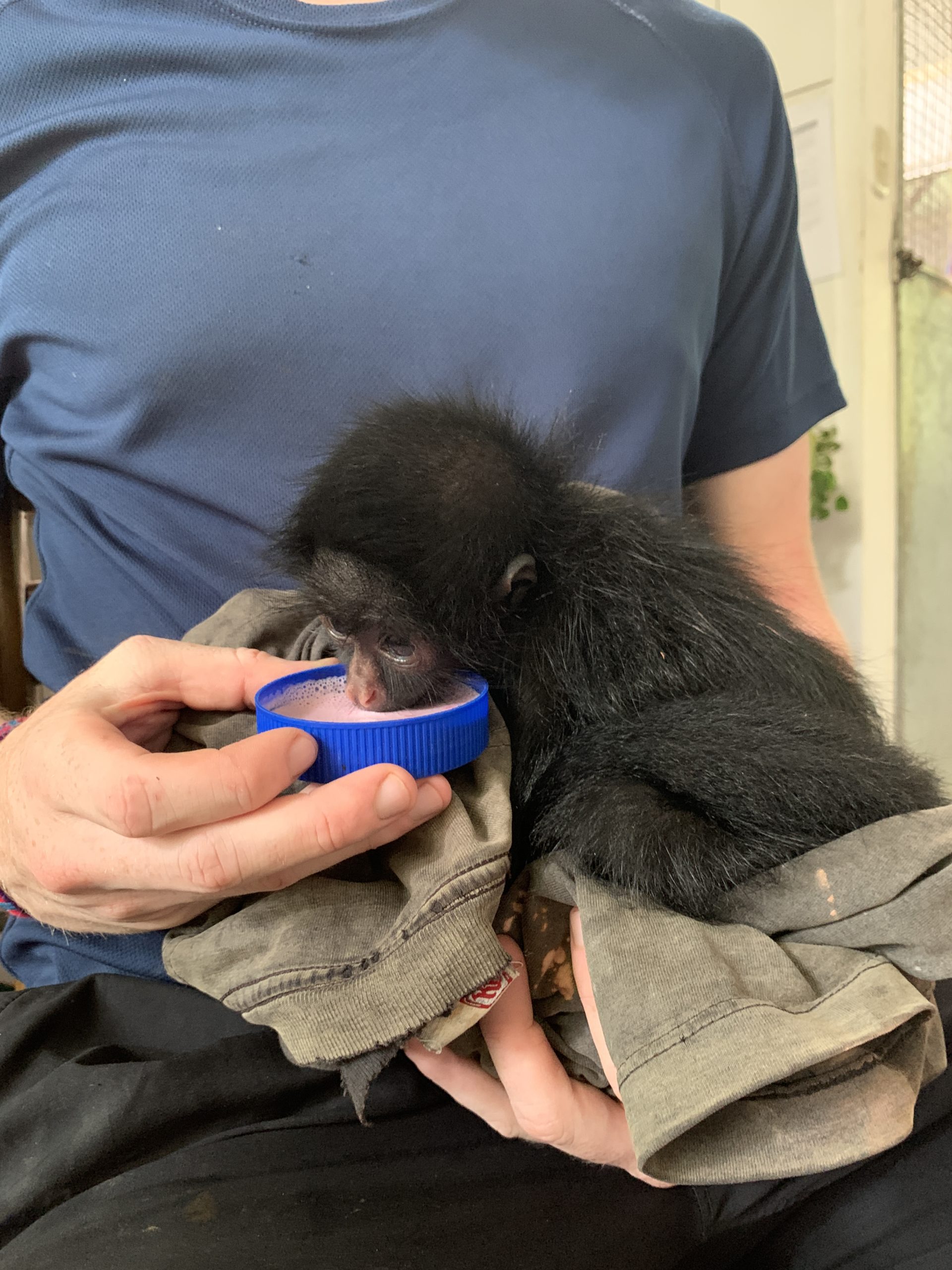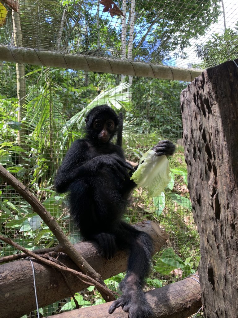 Miyo the baby black spider monkey male continues to live in the SUSTOAH and being so young is a highlight for many as he requires a lot of attention and nurturing that would normally be left to other monkeys. After a few false starts, Miyo is now able to drink his milk unassisted from a dish, and is making progress daily in other independent activities. We envisage Miyo spending some time in an enclosure with other monkeys very soon, giving him an outlet for his limitless energy as well as a chance to socialise with other monkeys.