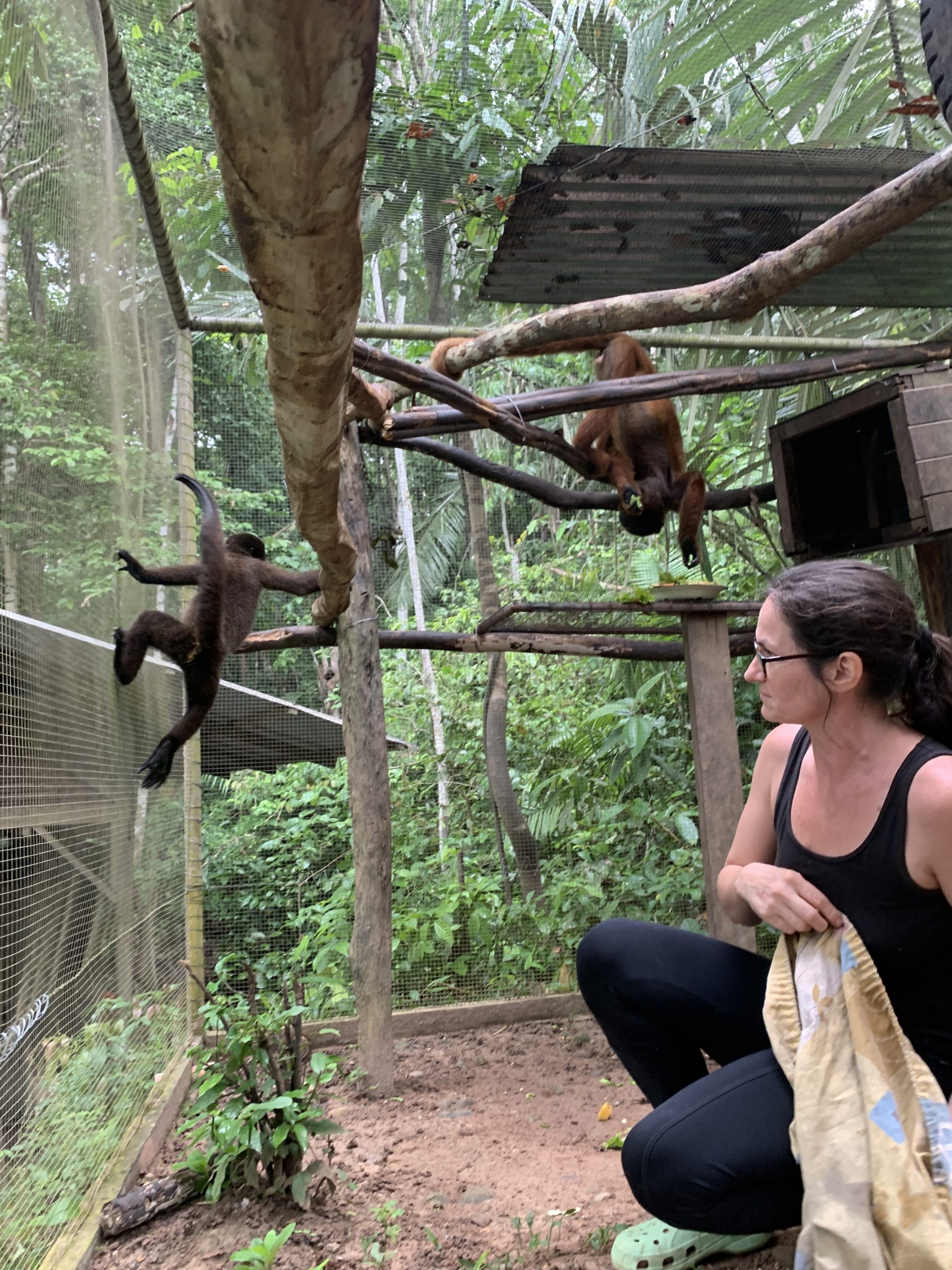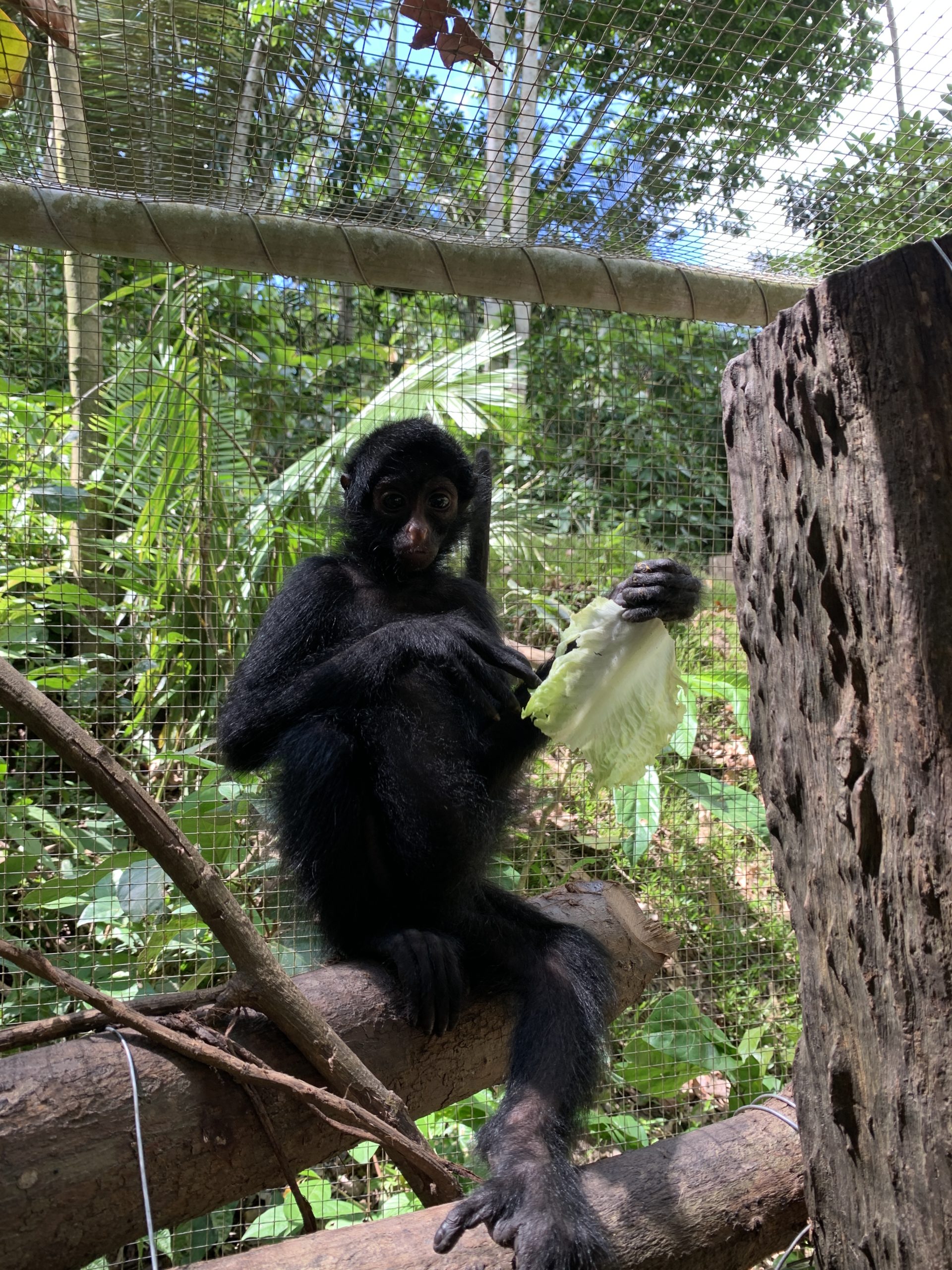 anchin (male woolly monkey with a broken leg) waiting for Lulu (female woolly monkey) to finish eating so he can get a bite!