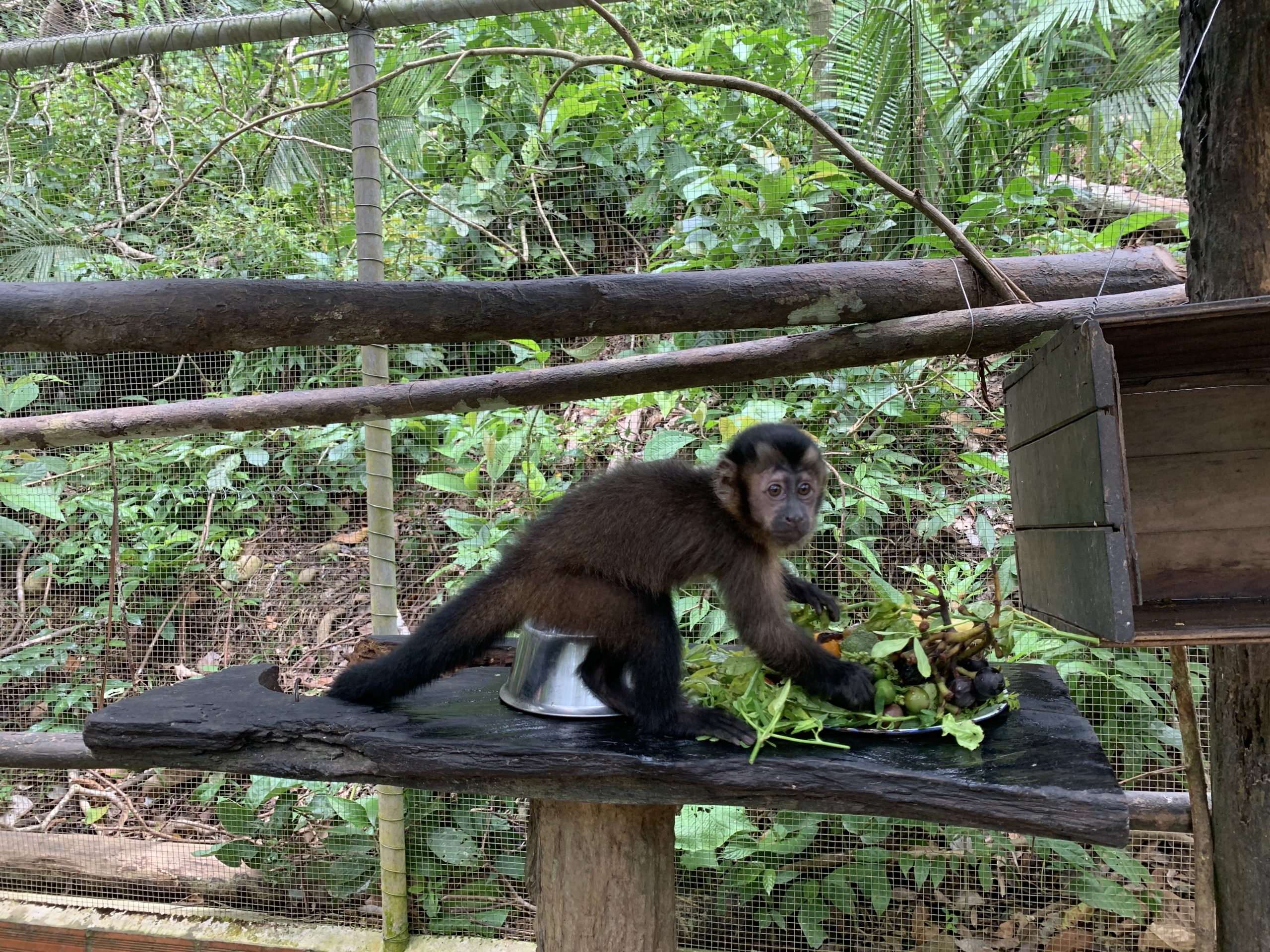 Rasu, juvenile male capuchin, during feeding time in Lulu enclosure