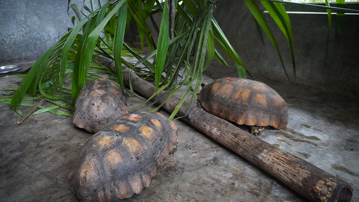 As the only rescue centre in the region, our quarantine space often fills up quickly. This month, we welcomed three yellow-footed tortoises (named now: Jeep, Opel and Chevrolet) and Kukuro, a yellow-crowned Amazon parrot, into the family. The tortoises are eager eaters, devouring cabbage and elephant ears in seconds! Kukuro, however, is more chatty than cuddly—he loves to talk but prefers to keep his distance from us. And just before the end of the month, we welcomed two more yellow-crowned Amazons.