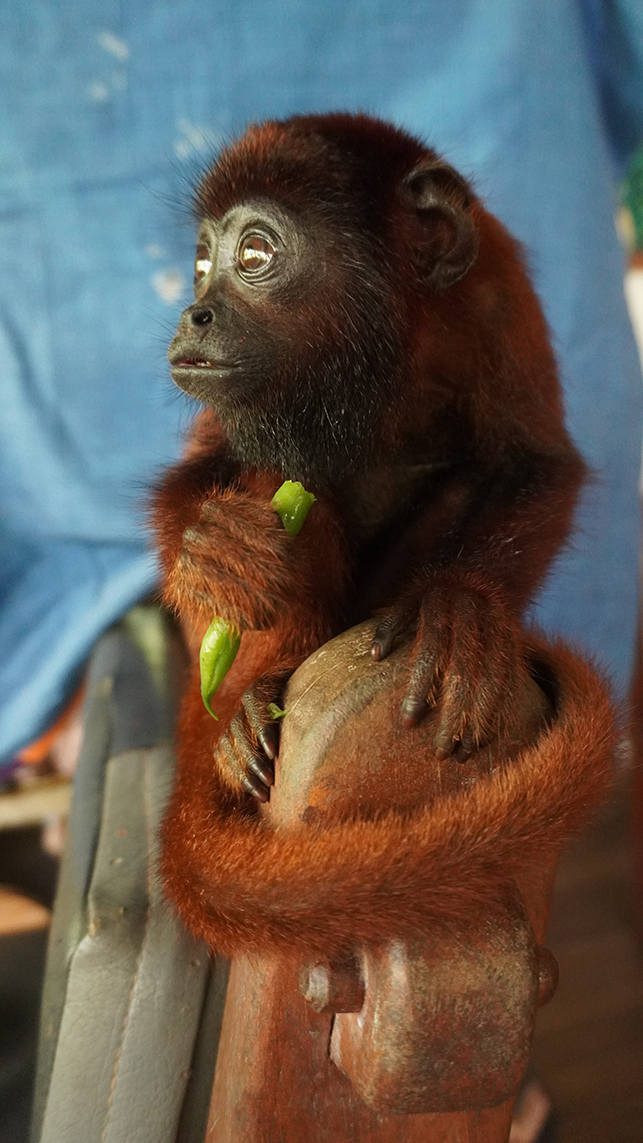 Moyo, the adult woolly monkey, has been struggling outdoors, gradually losing weight. It became clear that he needed extra care, so he was brought into the SUSTOAH. Moyo is now sharing the clinic with Tushko, enjoying the freshest, juiciest food we can offer as he regains his strength.
