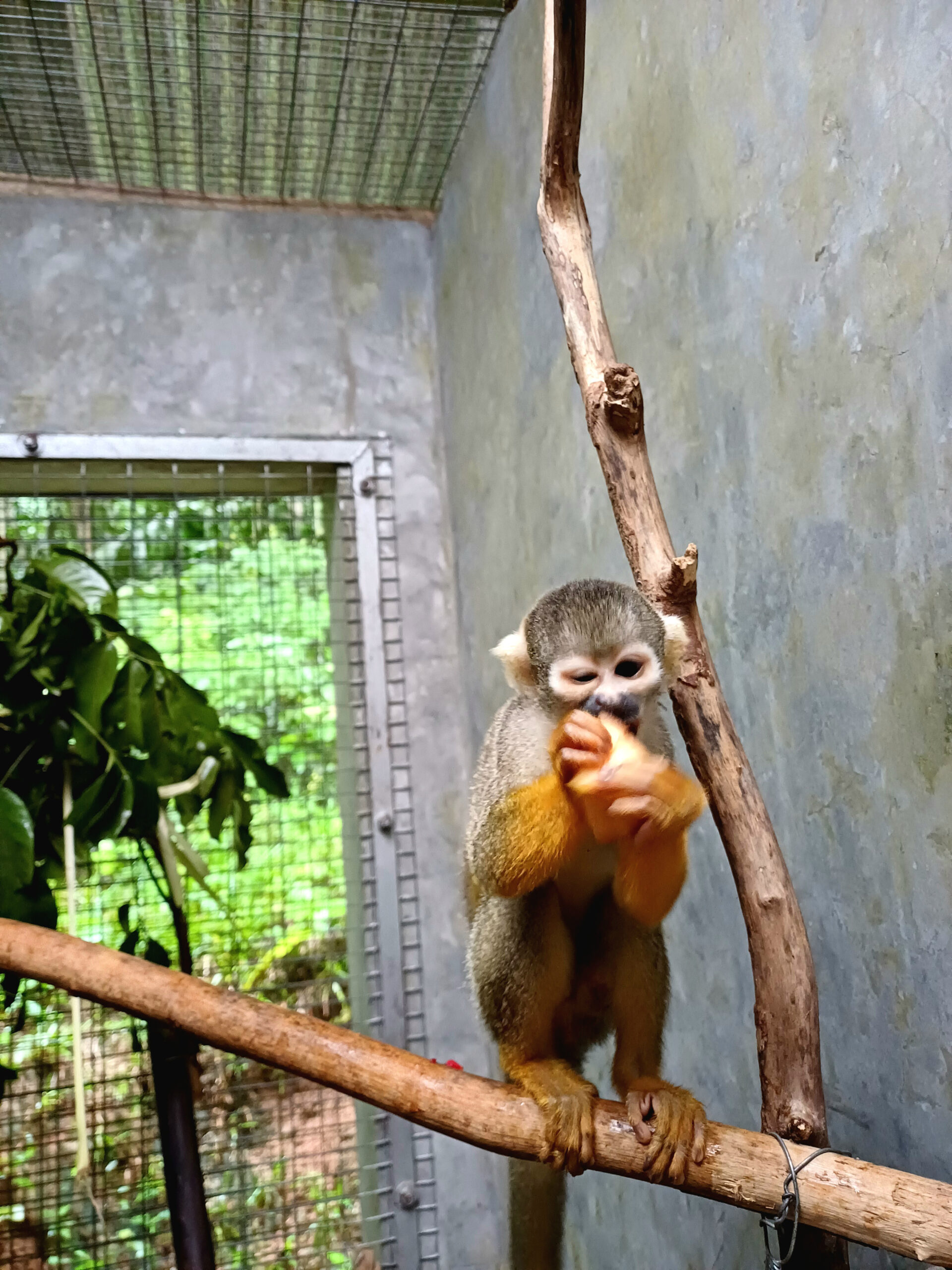 Dina, the juvenile female squirrel monkey, found herself in trouble when she came back with several bites. After a quick trip to the operating table for some stitches, she spent a few weeks inside to ensure proper healing. As Olivia would say, squirrel monkeys are “tough cookies,” and Dina was soon back on her feet!