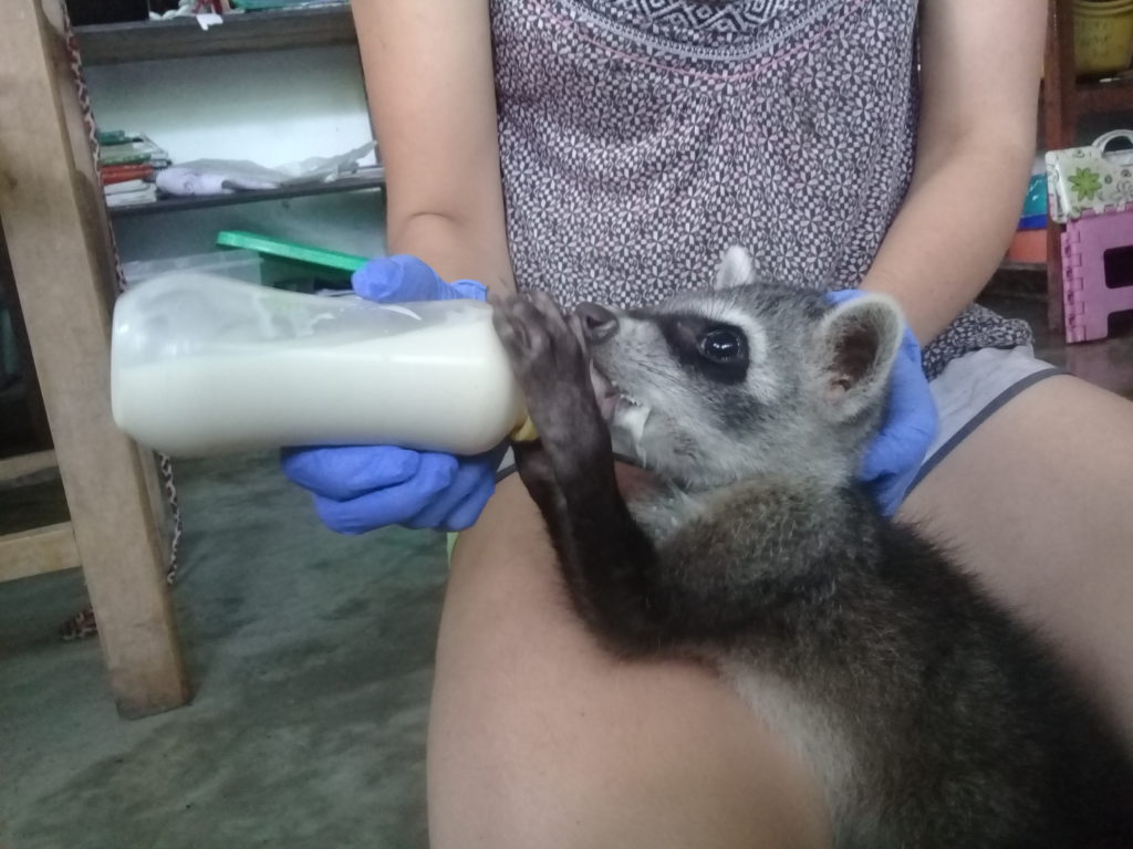 While Olivia was at the Ministry in Pucallpa she received a special request and one hard to say no to; a very young female crab eating raccoon, Eona. So again, as mostly with her trips to the city, she returned with a new animal. She was left abandoned at the ministry in Pucallpa. She still is bottle fed as she is so young. Once eating solids and grown up enough, she will become another animal released to enjoy the sanctity of Esperanza Verde, and hopefully she will find her way to Rumani or Mokwai, our earlier released crab eating raccoons.