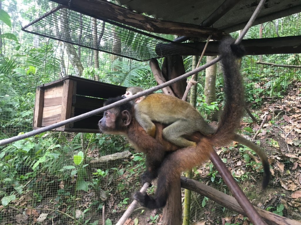 Traya (juvenile young large headed capuchin), made the move from the SUSTOAH into Pepe enclosure this month. With her quarantine period having passed without any issues, she now had just a small barrier between her and the other monkeys before being released to join our outside troop. Shimi (young male squirrel monkey living outside) recently was caught when he was seen limping with one arm. After a medical check, he was closed in with Traya, giving him a chance for a well-balanced diet and recovery while providing companionship for Traya. After some days they already formed a friendship and they were released a week later. Traya is a welcome addition to the outside monkeys, frequently being seen playing with the other young capuchin monkeys, while Shimi found his own way again in the outside world at EV.
