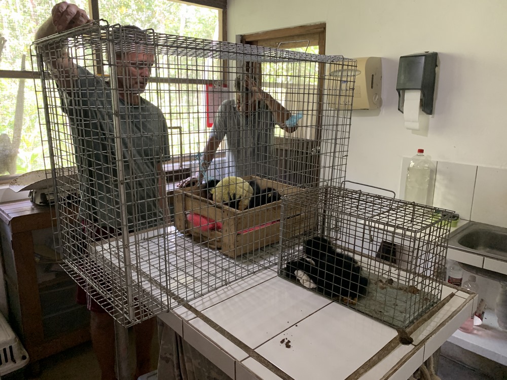 Dakiri, one of our resident female agoutis, spent a few days in the clinic after she was seen with a massive lump on her side. Being one of the less tame agoutis meant that both Olivia and Douwe had to be on their “A” game and after a few near misses Dakiri was in a bag and transported to the SUSTOAH for closer inspection.